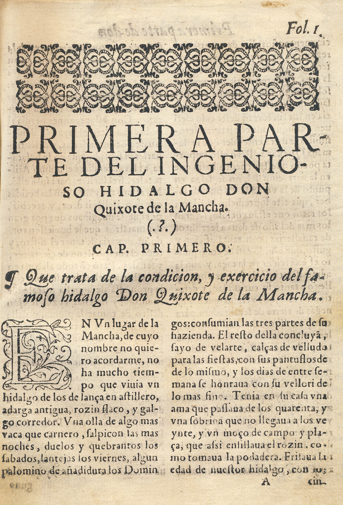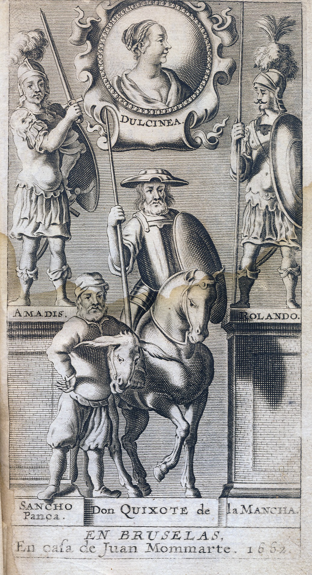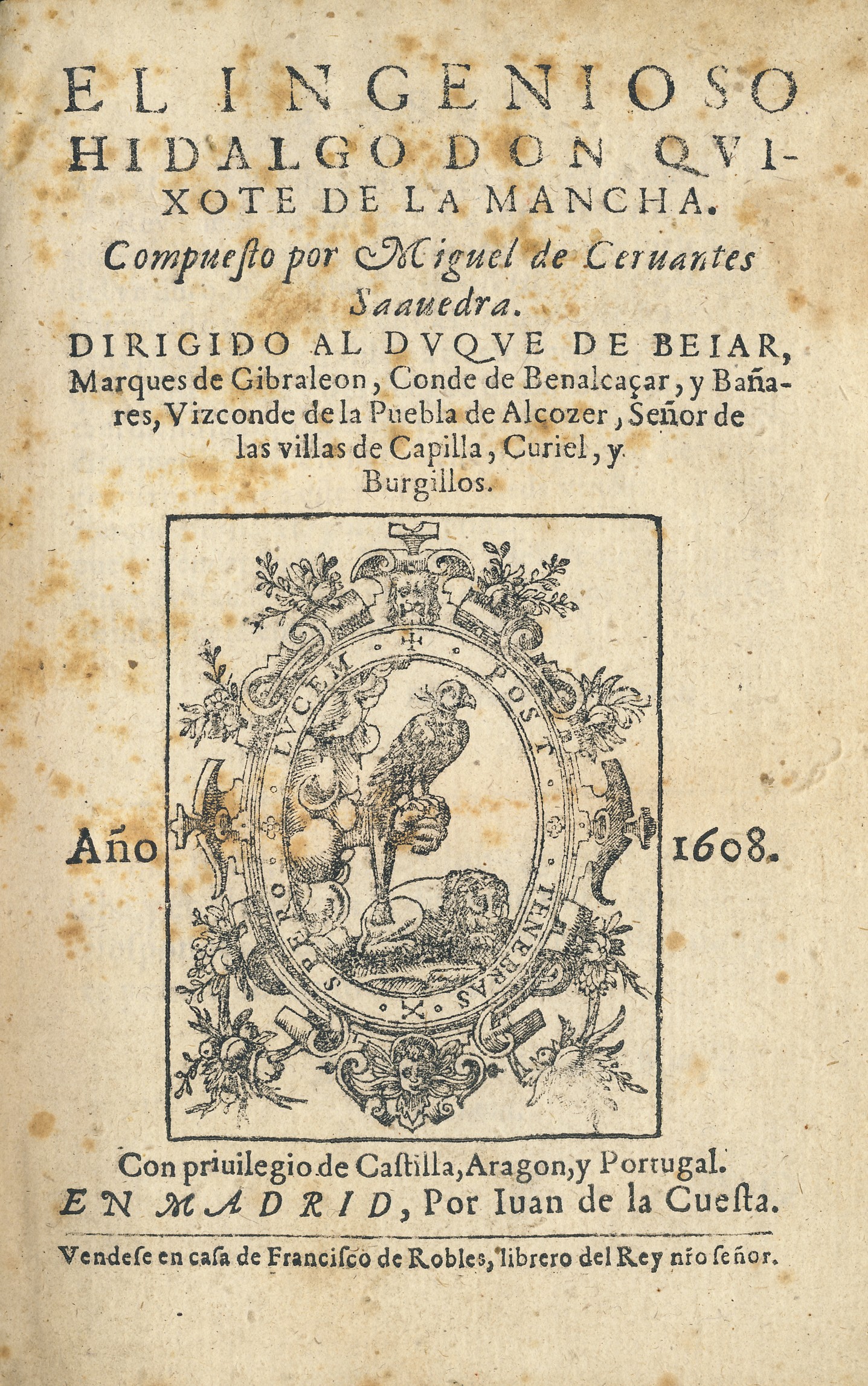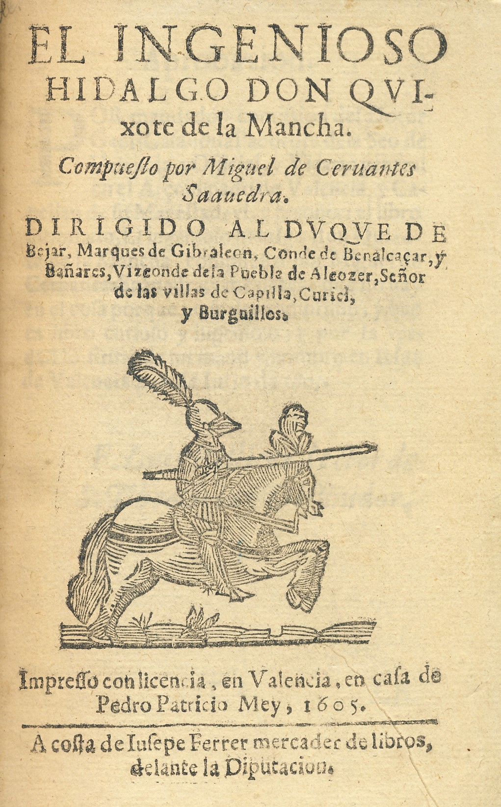 Miguel de Cervantes Saavedra (1547-1616): El ingenioso hidalgo don Quijote de la Mancha. Valencia: Pedro Patricio Mey, 1605. Inventario 2604. Exlibris de D. D. le Tellier de Courtanvaux.