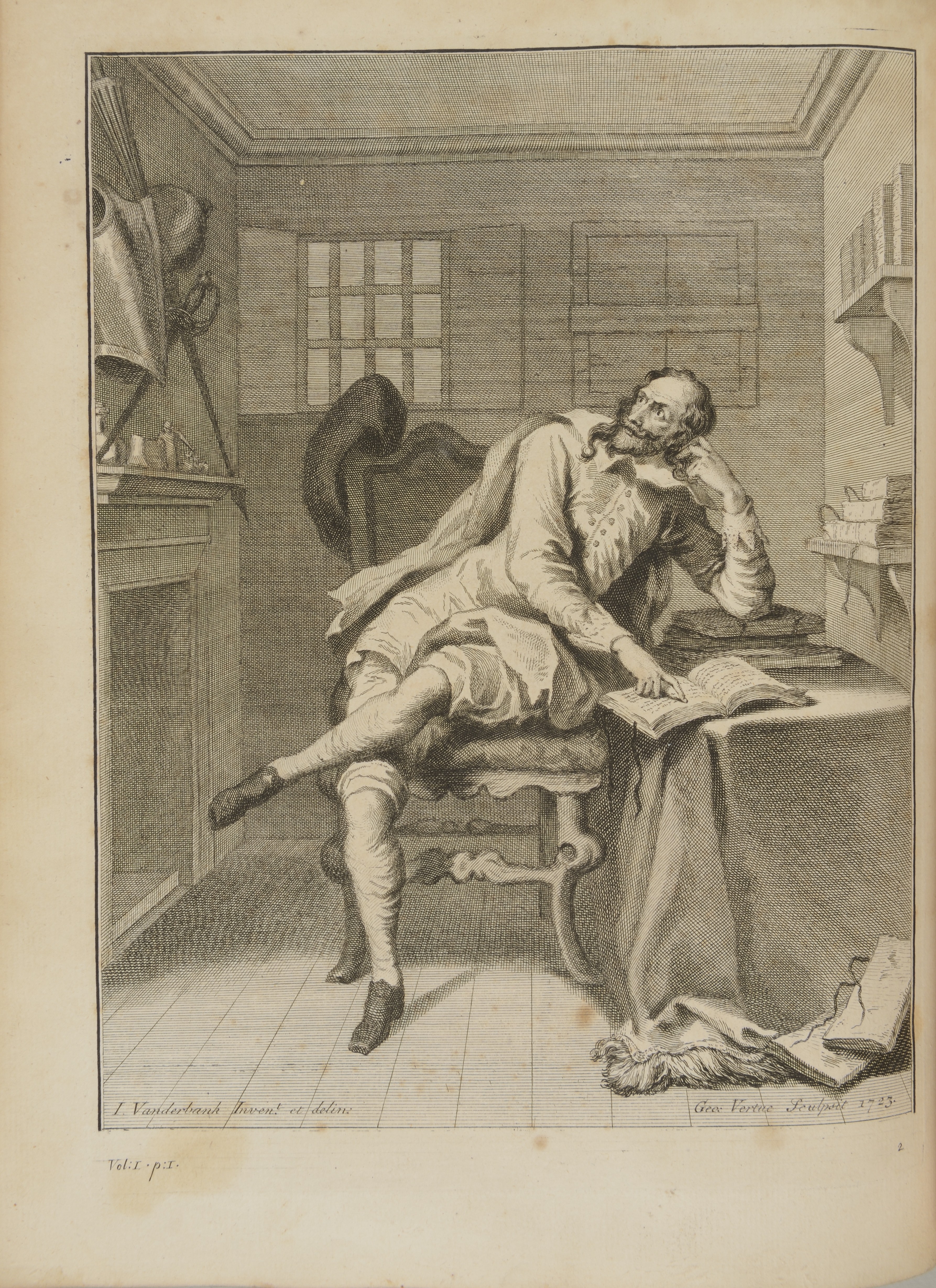 Miguel de Cervantes Saavedra (1547-1616): Vida y hechos del ingenioso hidalgo don Quijote de la Mancha. Londres: por J. y R. Tonson, 1738 Inventario 2269. Exlibris de Juan Manuel de la Helguera