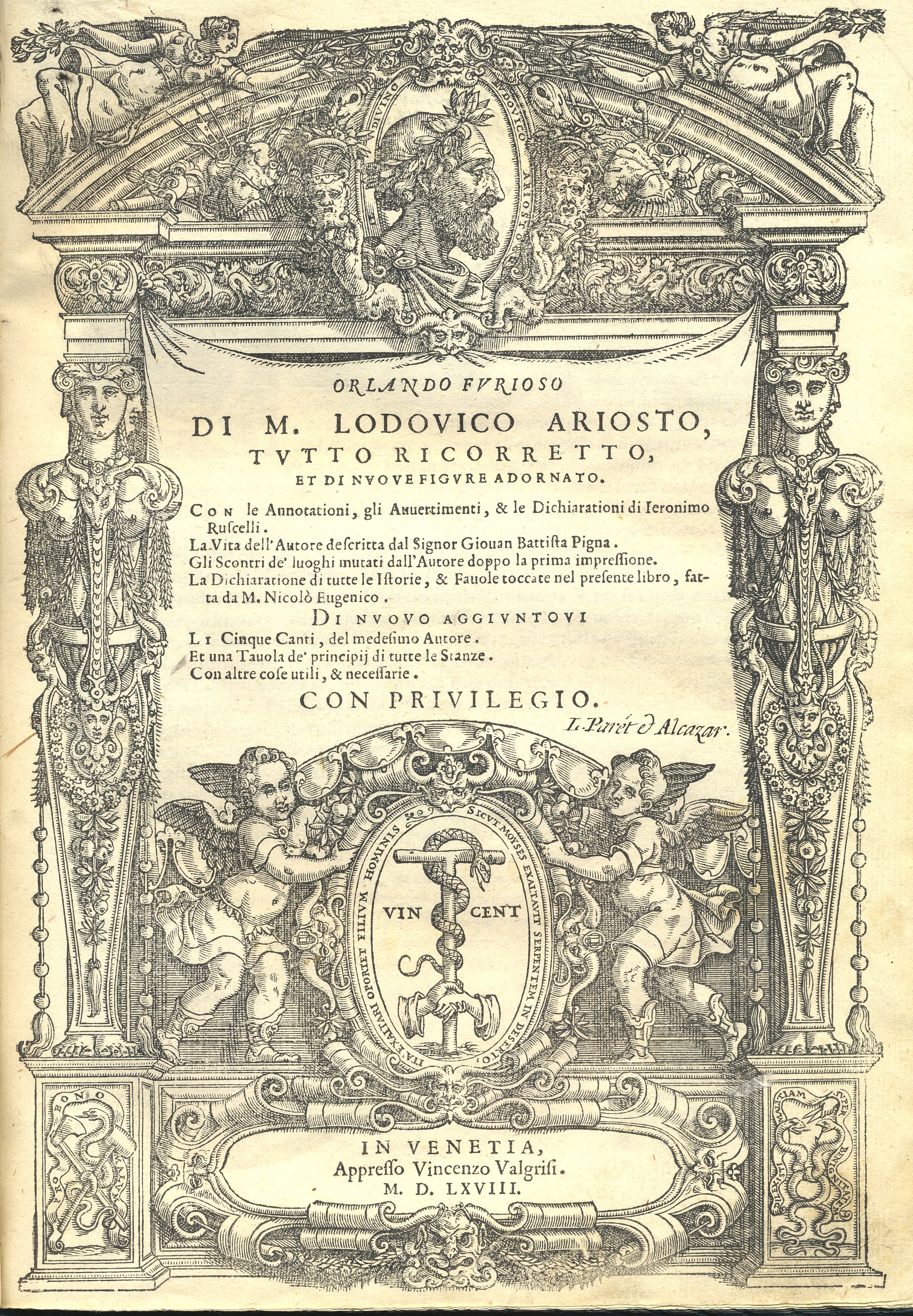 Ludovico Ariosto (1474-1533): Orlando furioso. Venecia: Vincenzo Valgrisi, 1568 Inventario 12454. Exlibris manuscrito del Conde de Altamira y de Luis Paret y Alcazar (1746-1799)