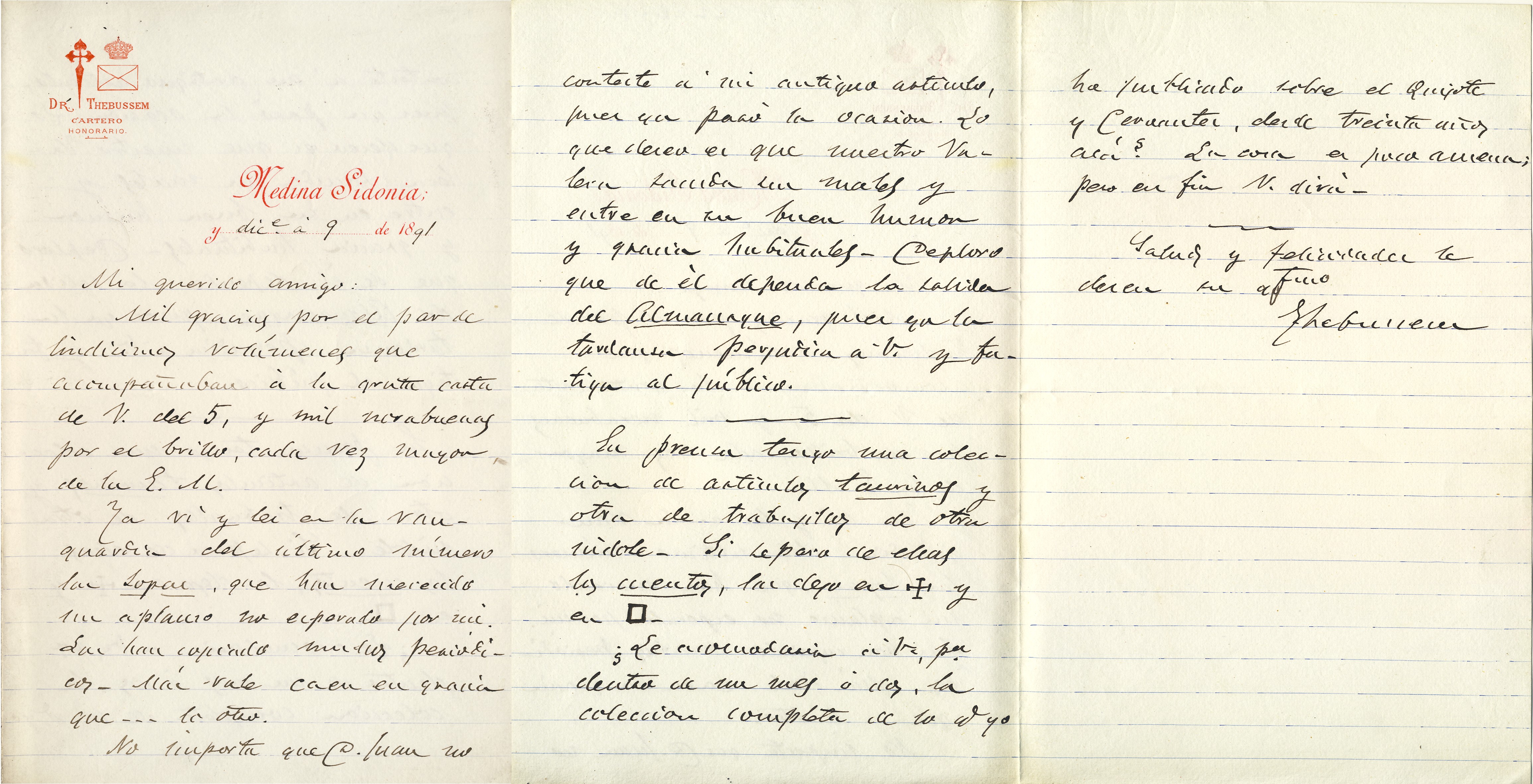 Doctor Thebussem, seudónimo Mariano Pardo de Figueroa (1829-1919). Carta a José Lázaro, 9 de diciembre de 1891. Archivo España Moderna.