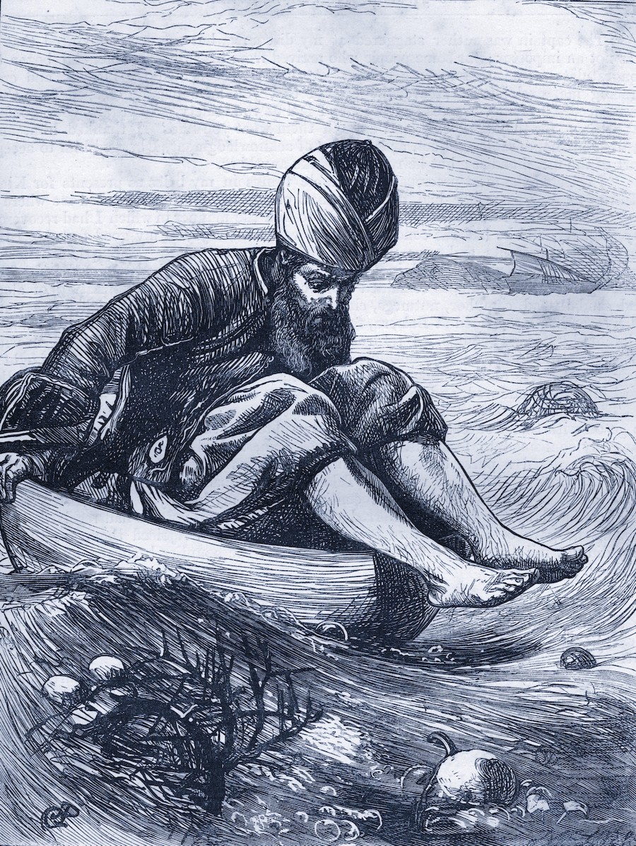 Pero Alah el Altísimo veló por mí y me libró de ahogarme, poniéndame al alcance de la mano una especie de cubeta grande de madera, llevada allí por los pasajeros para lavar su ropa. Me aferré primero a aquel objeto, y luego pude ponerme a horcajadas sobre él, gracias a los esfuerzos extraordinarias de que me hacían capaz el peligro y el cariño que tenía yo a mi alma, que me era preciosísima. Entonces me puse a batir al agua con mis pies a manera de remos, mientras las olas jugueteaban conmigo haciéndame zozobrar a derecha e izquierda.