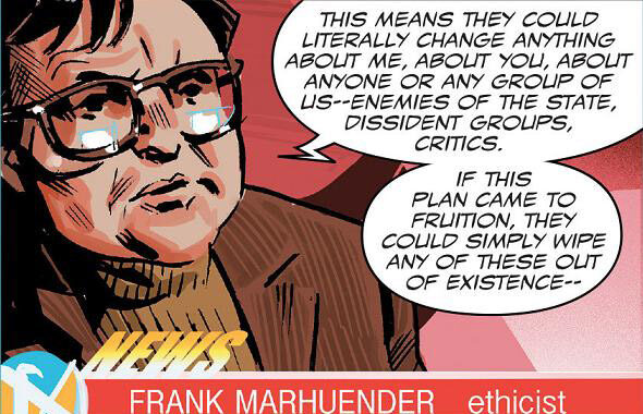 El personaje tiene un cierto parecido físico con el periodista –flequillo, gafas- pero lo que no deja lugar a dudas es su nombre: Frank Marhuender, un experto en ética.