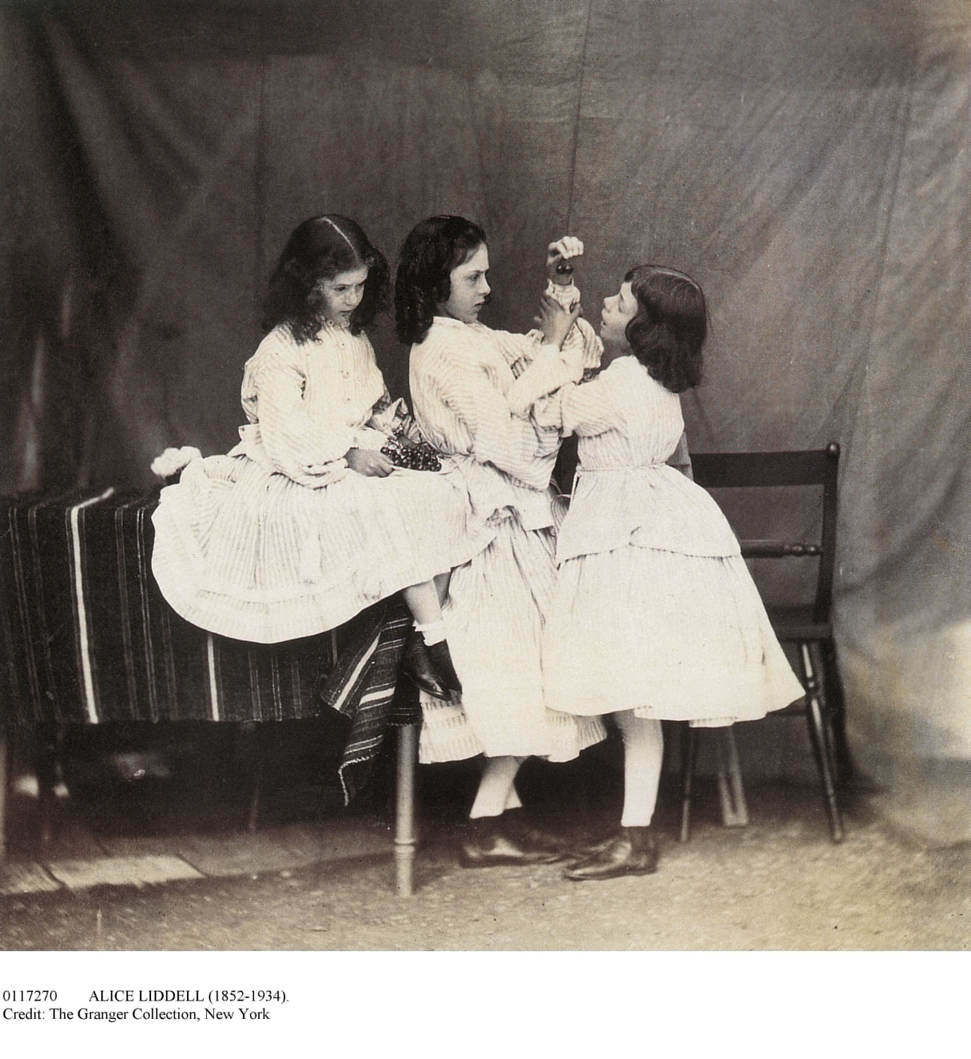 Alice (derecha) y sus hermanas, Edith y Lorina, comen cerezas en una fotografía escenificada por Carroll (1858).