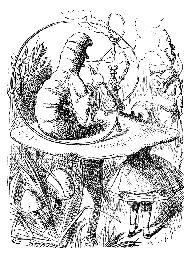 Ilustración de John Tenniel. La Oruga es muy grosera con Alicia. Mide siete centímetros y está sentada en una seta. En la ilustración dos de las patas hacen las veces de nariz y boca.