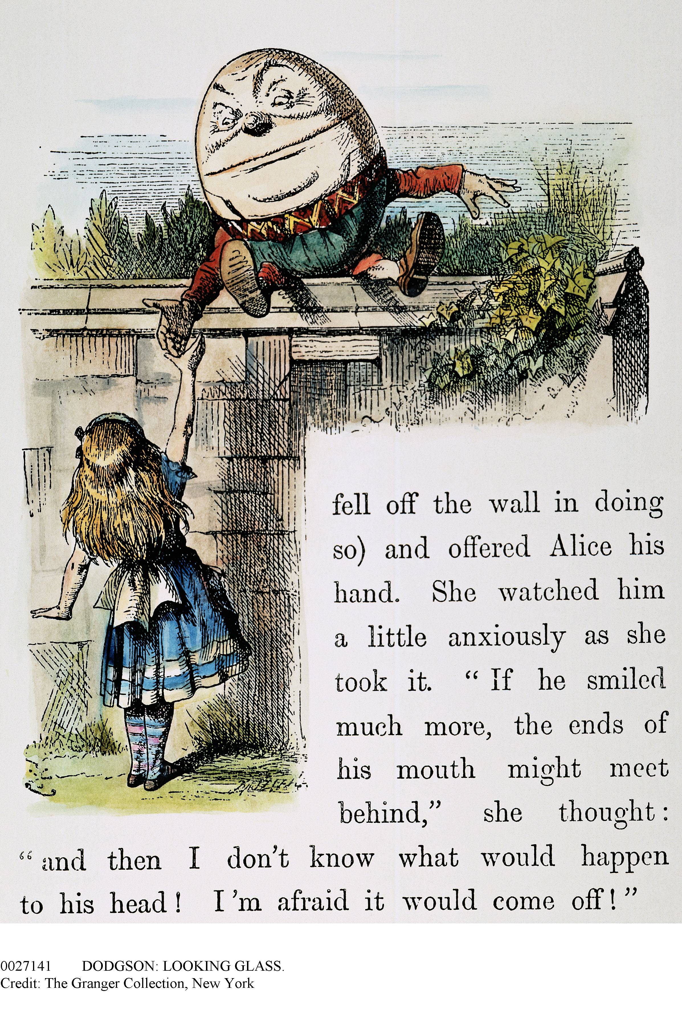 Humpty Dumpty ofrece la mano a Alicia. Inspirado en el diseño de Sir John Tenniel para la primera edición de 1872 de Lewis Carroll para A través del espejo.