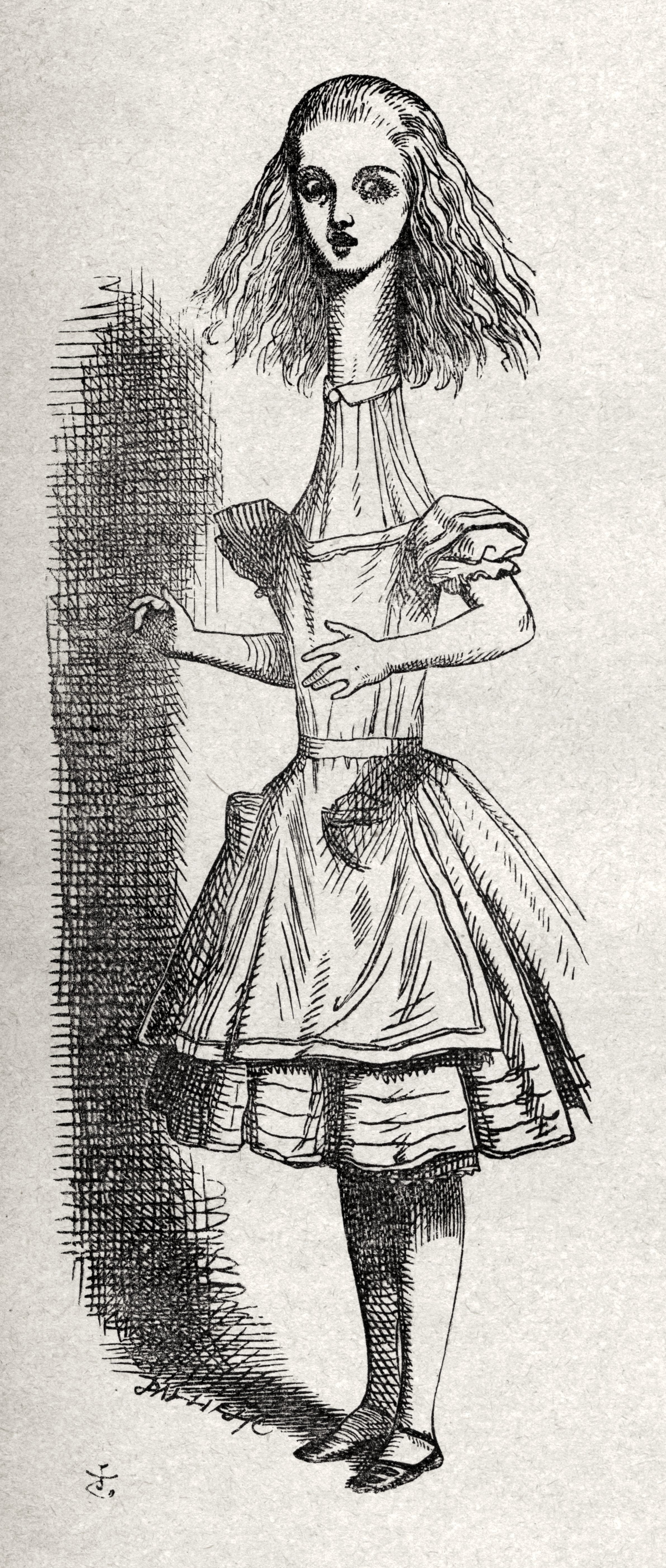 Dibujo original de 1965 de John Tenniel. Momento en que le crece el cuello a la protagonista.