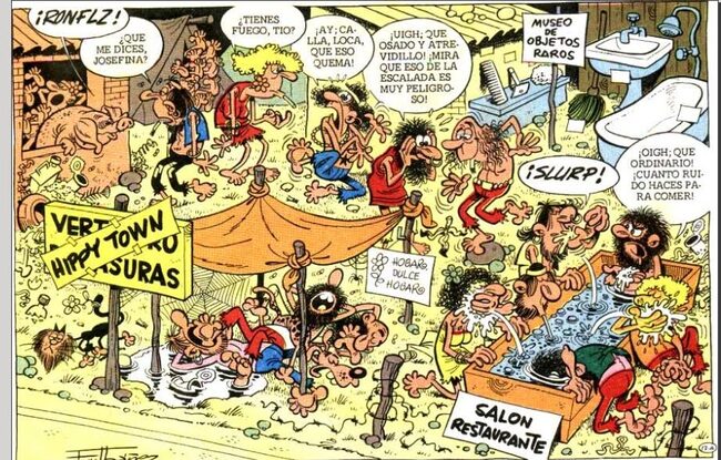 Y sobre todo, me gustan los detalles, las viñetas en las que Ibáñez parece disfrutar más y nos mete una veintena de chistes en una imagen más trabajada, como el hilarante campamento hippie de El Bacilón, que he de decirles que me recuerda intensamente a lo que era la Puerta del Sol en el momento más glorioso del 15M.