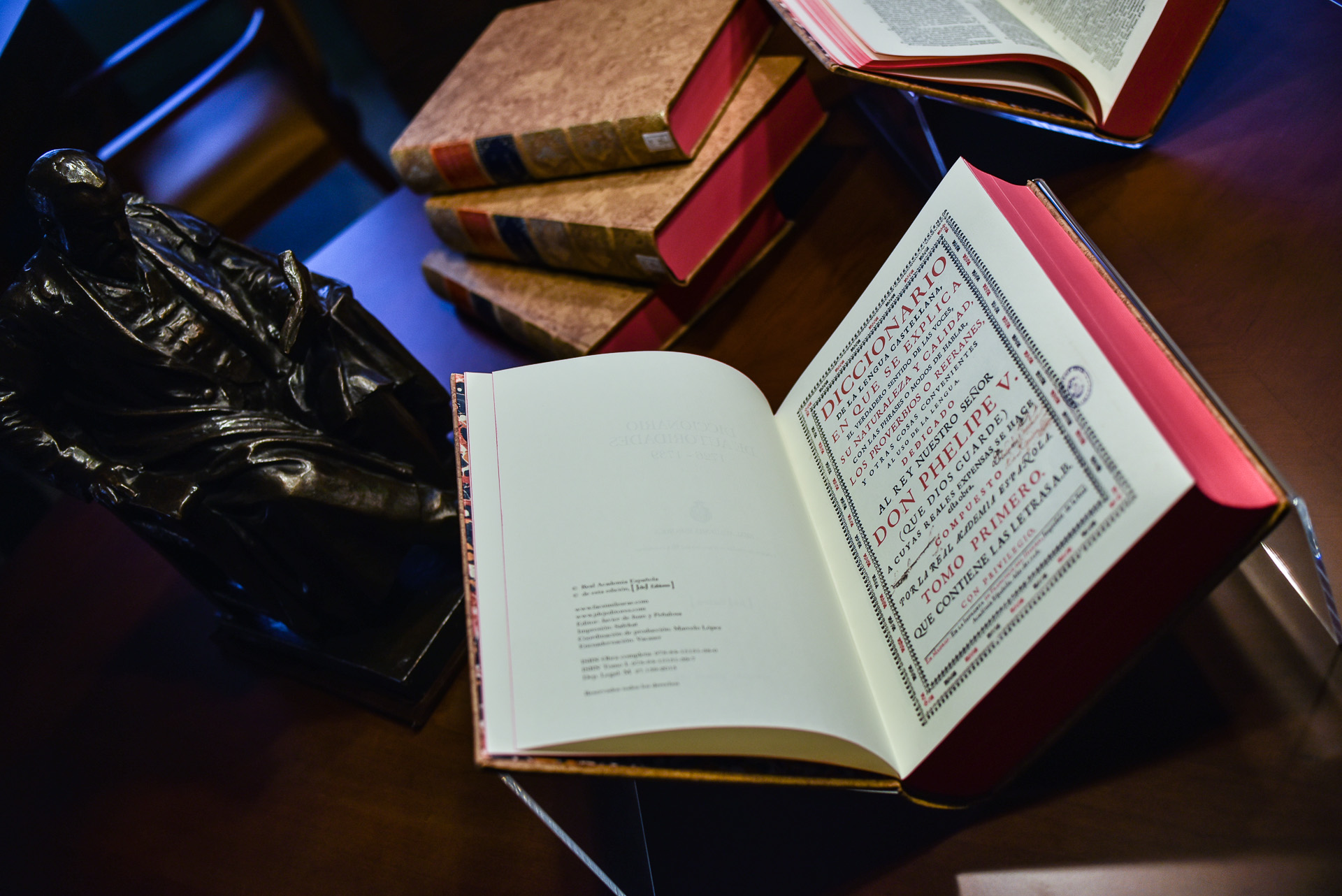 Varios diccionarios y otros libros de consulta sobre una de las mesas de la sala.