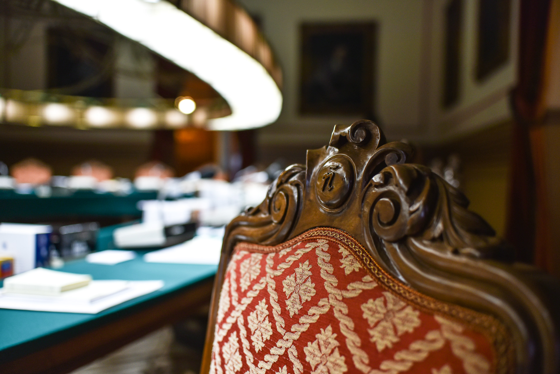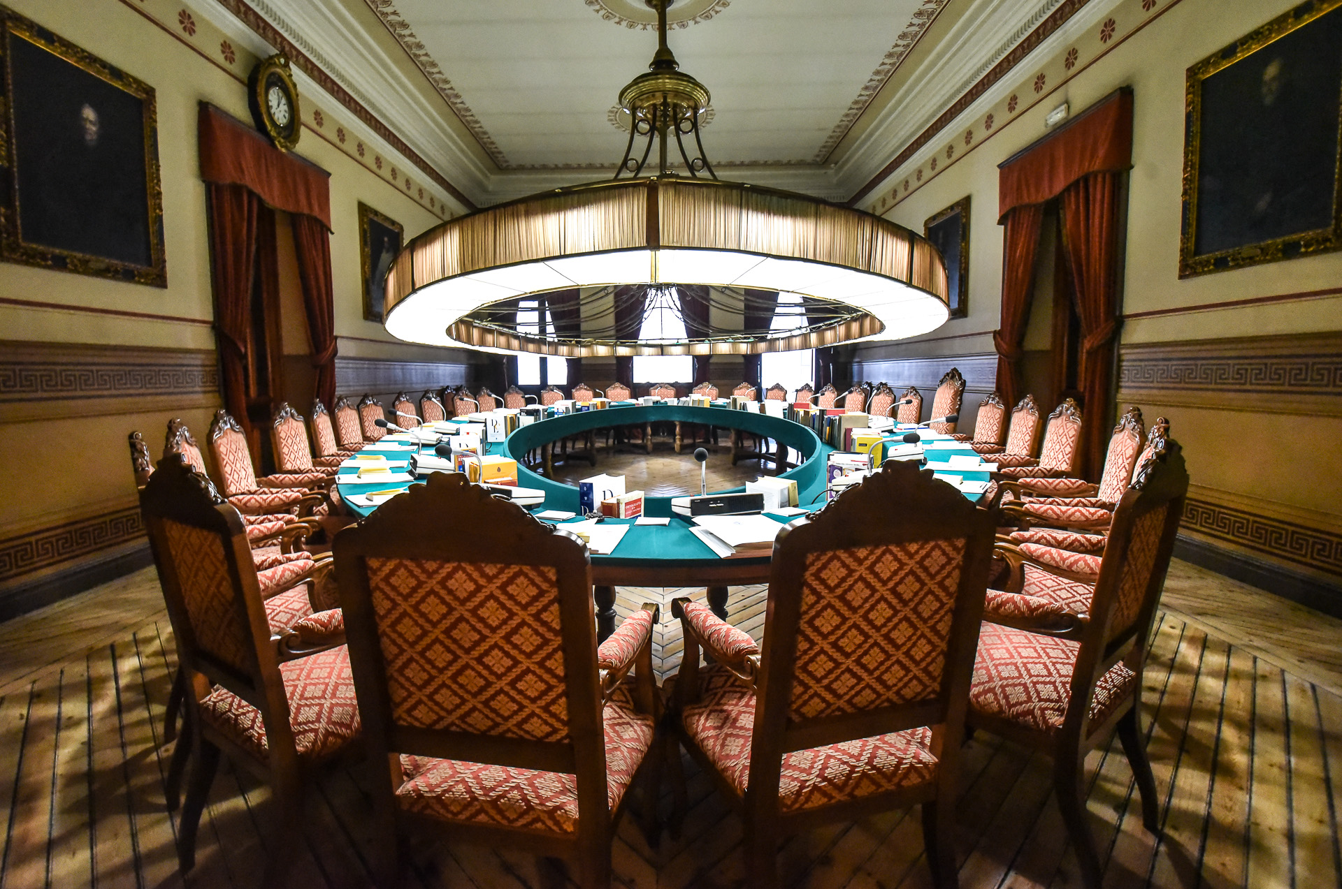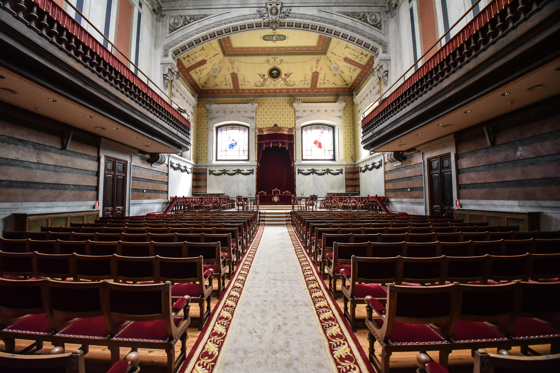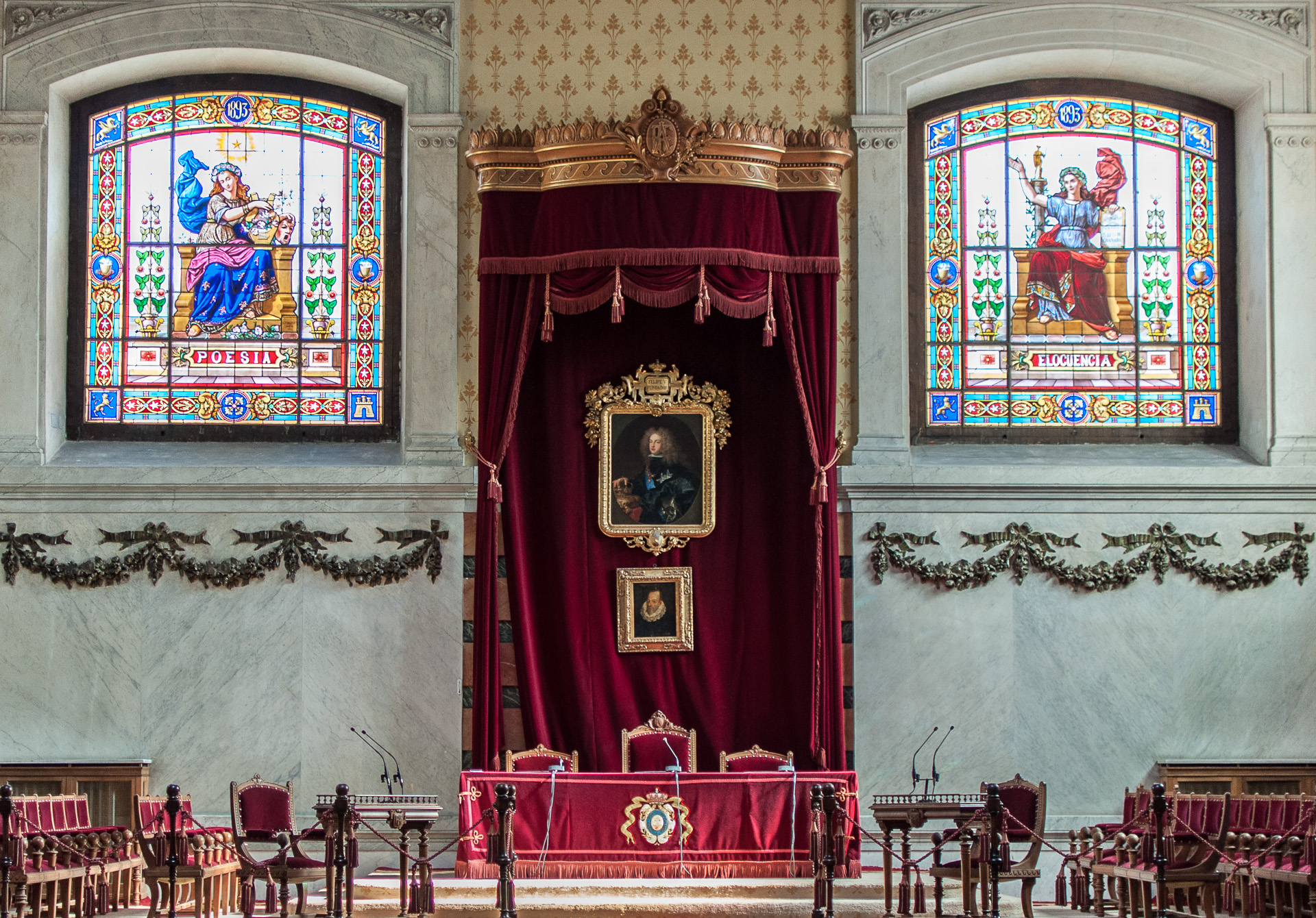 El amplio salón de actos de la Real Academia Española donde tienen lugar las ceremonias de ingresos de los nuevos académicos, entre otros eventos.