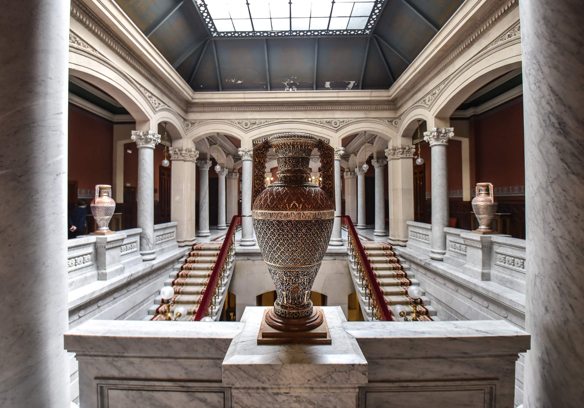 Ya en el segundo piso, varios jarrones adornan los arcos de marmol que iluminan el claustro.