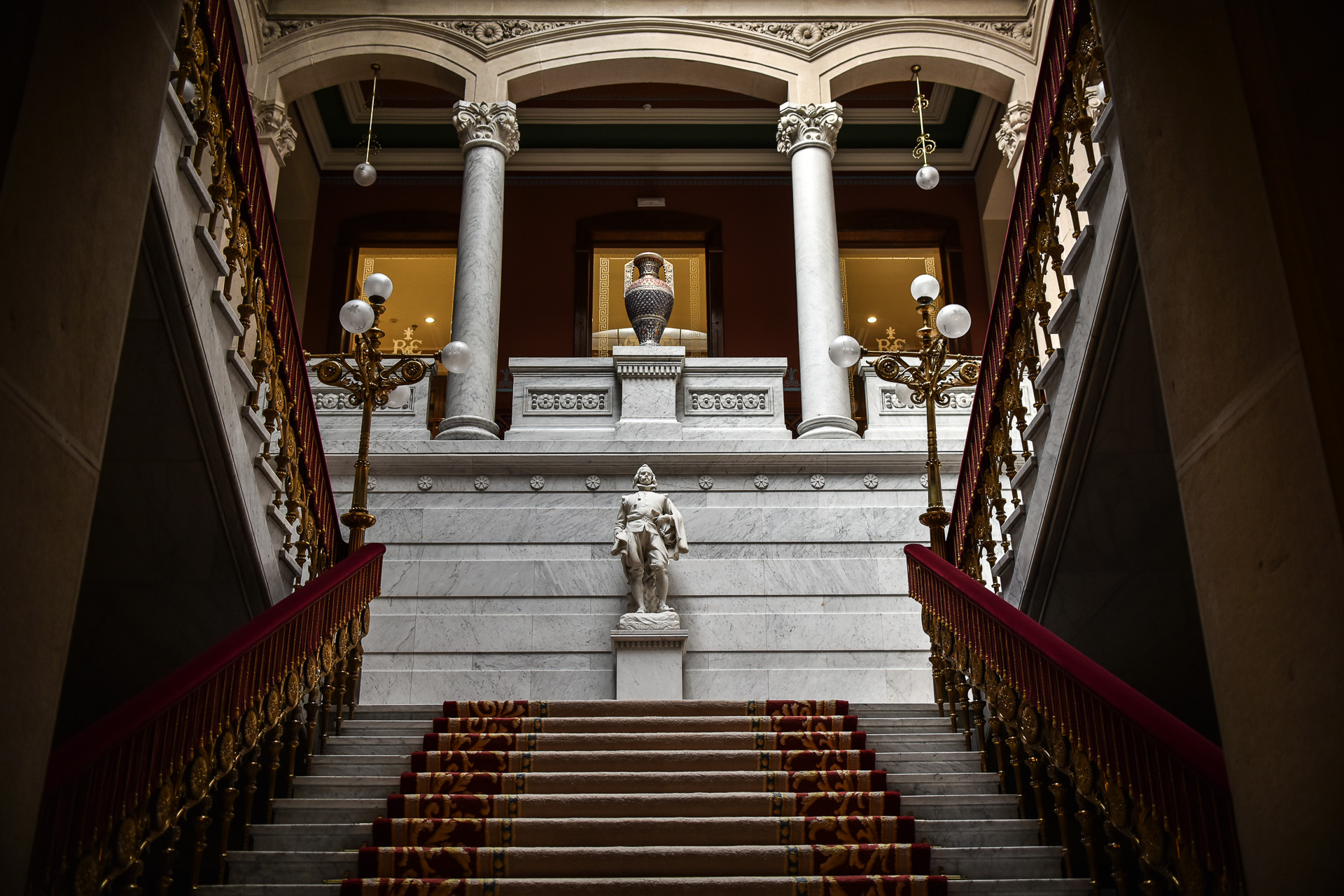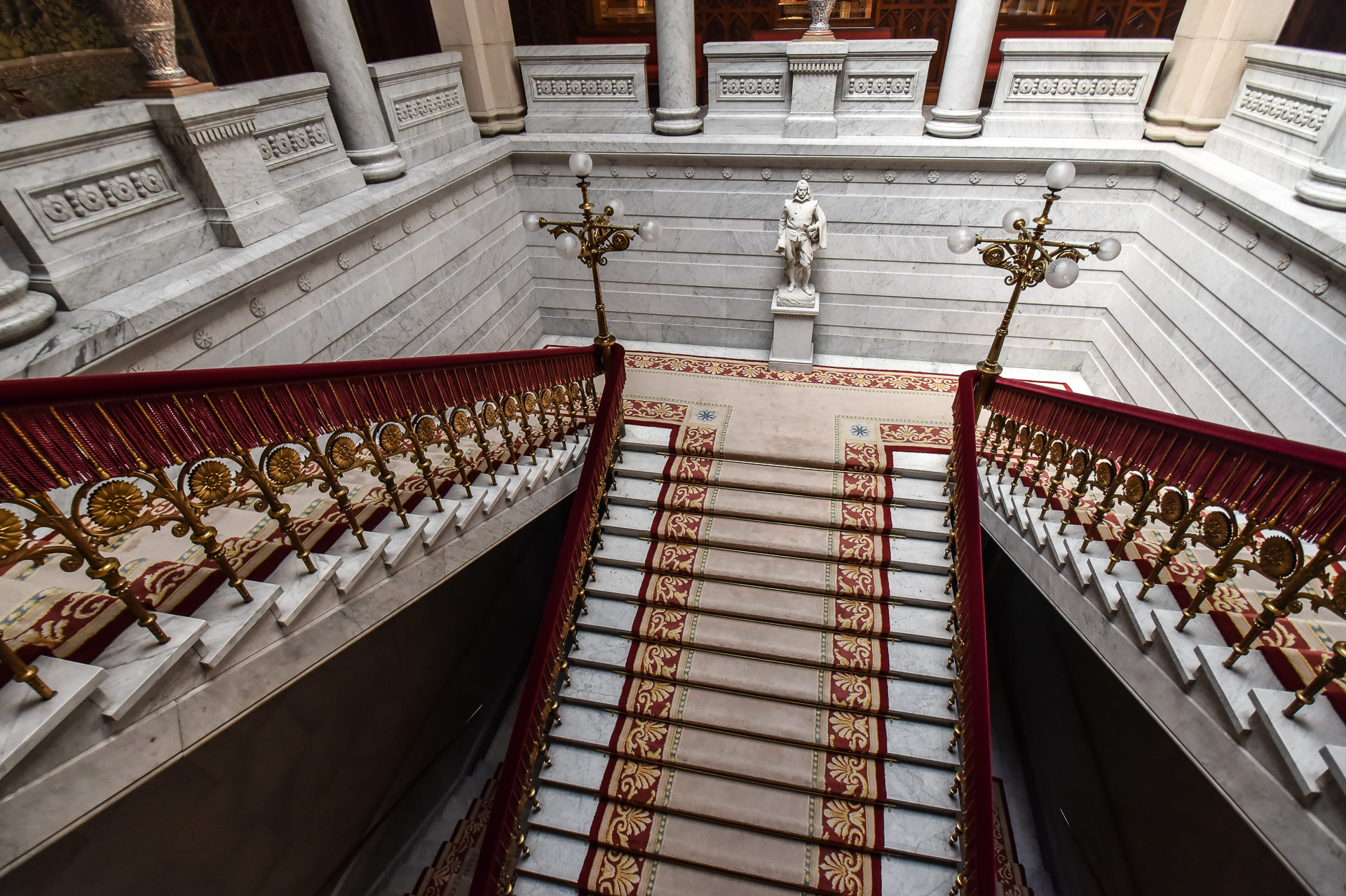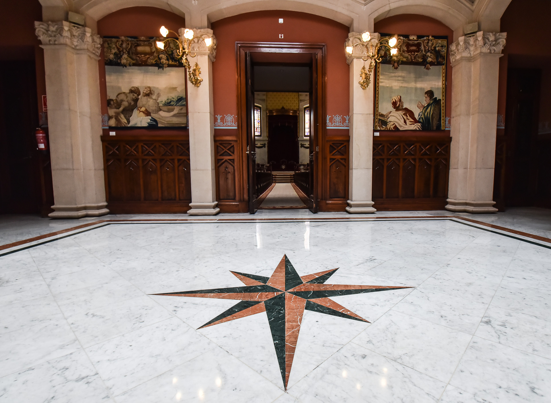 Al entrar por su puerta lateral lo primero destaca son sus majestuosas escaleras alfombradas.