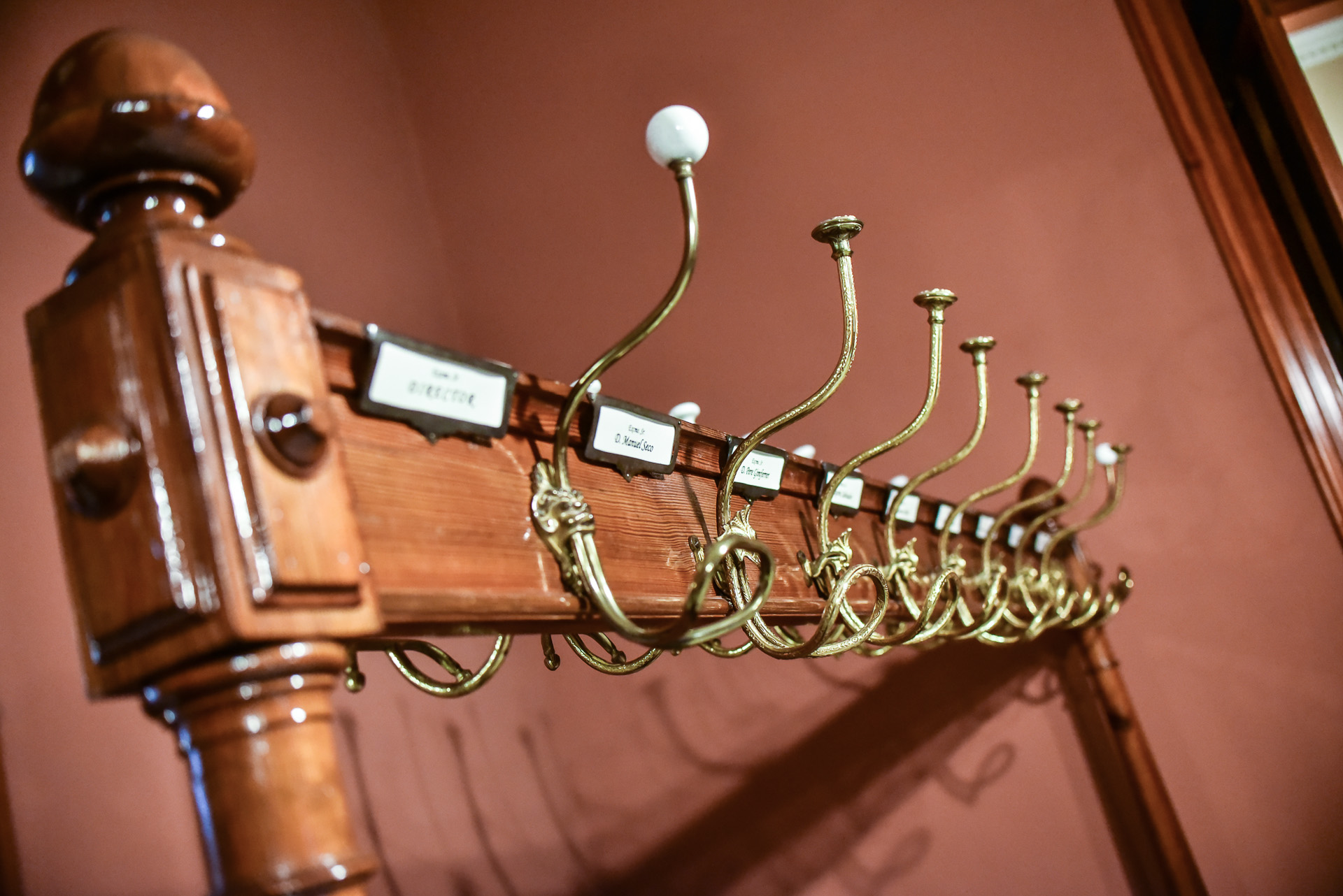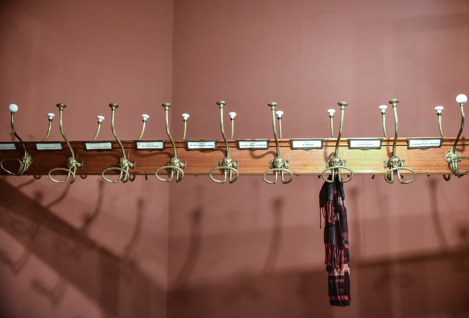 En el vestíbulo del Salón de Plenos se encuentran los percheros, dedicados también a cada uno de los académicos y etiquetados por orden de antigüedad.