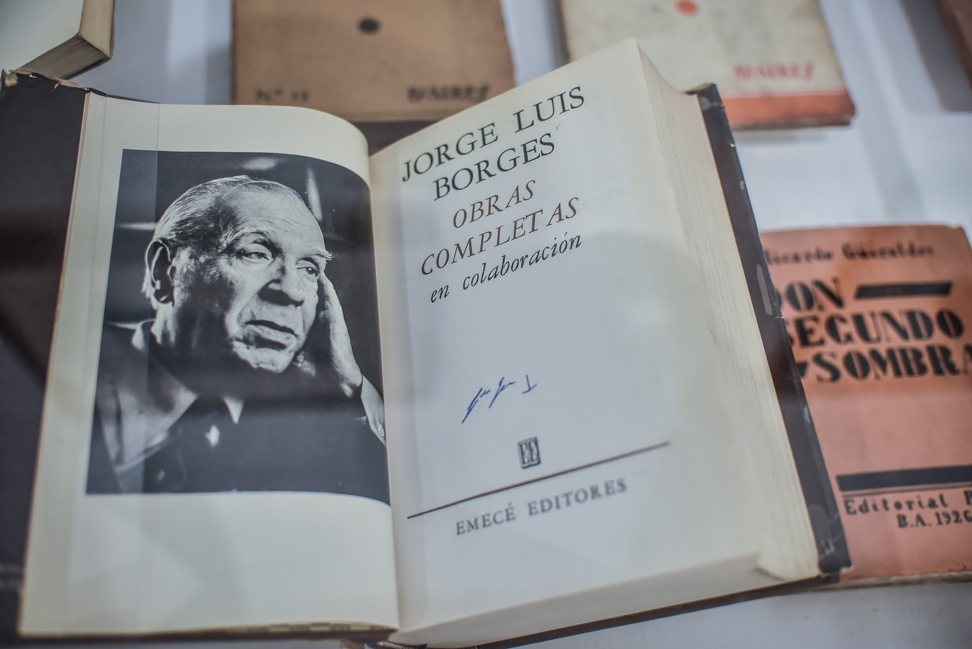 Uno de los ejemplares que se pueden ver en la exposición, Obras completas en colabboración, de Jorge Luis Borges y otros, firmada por el propio Borges.