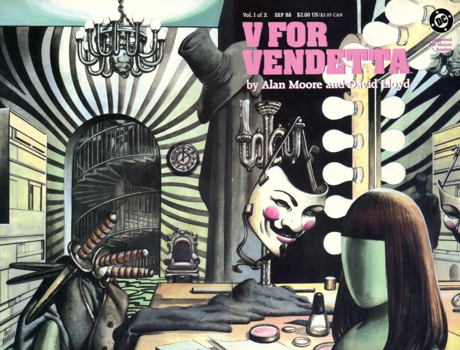 V de Vendetta es una de sus obras más reconocibles por el público menos especializado. Está ambientada en Reino Unido durante un futuro cercano en el que gobiernan los fascistas. Como oposición, surge un misterioso revolucionario oculto tras una máscara que emprende una violenta campaña para derrocar al gobierno.