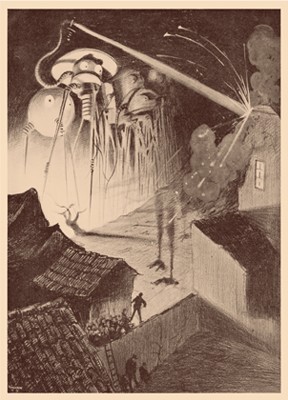 No tuvieron la misma suerte los dibujos del brasileño Henrique Alvim Corrêa, realizados para una edición belga de la novela en 1906 de la que solo se tiraron 500 ejemplares. Se trató de la primera ilustración completa de la obra. Alvim Correa trabajó en Londres, realizó los bosquejos y buscó a Wells. El encuentro marcó la iconografía de La guerra de los mundos. El británico quedó encantado, hasta el punto de que declaró que Alvim había hecho más por la obra con su pincel, que él con su pluma. Y es que la imagen de los marcianos, esos trípodes con tentáculos y rostro inexpresivo, que daban enormes zancadas entre edificios y gente, son del brasileño. Este es el éxito de la edición de Los libros del zorro rojo: haber unido la mejor traducción, la de Maeztu, con la ilustración clave de la obra. Atentos a esta editorial y a sus cuidadísimos trabajos, como los de Lovecraft o Poe.