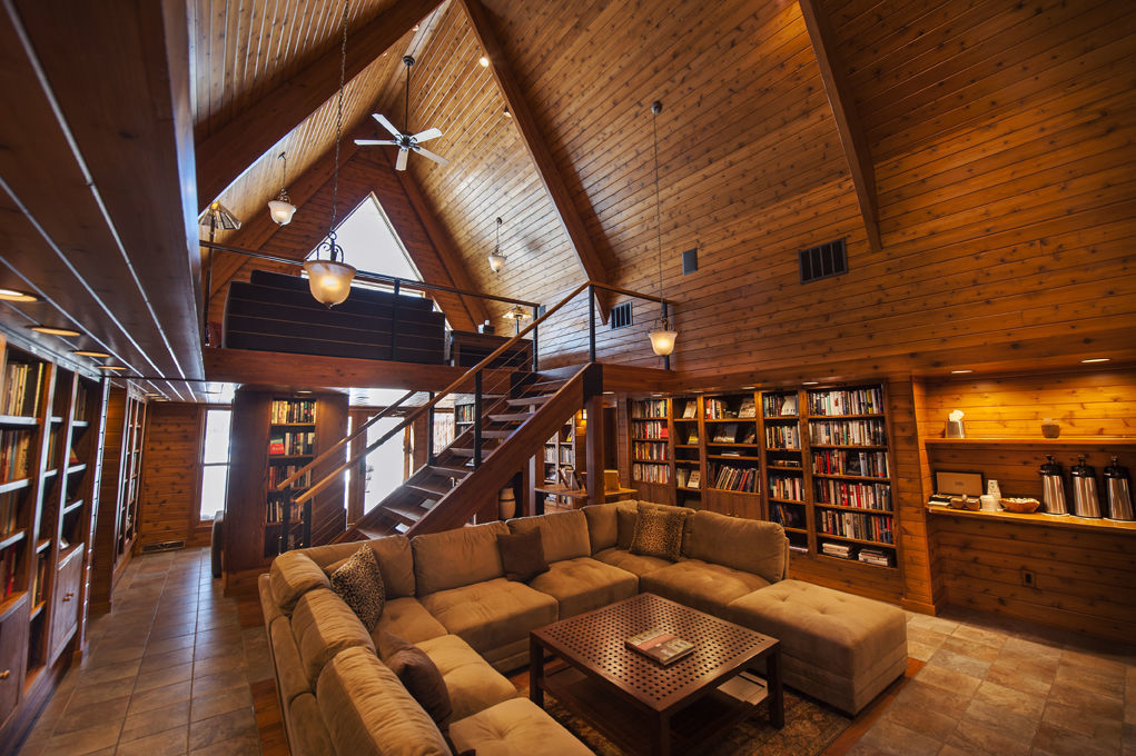 El hotel Canoe Bay en Wisconsin está muy enfocado a los encuentros empresariales y las reuniones, pero cualquier cliente podrá disfrutar de la bellísima biblioteca, en un salón de un elegantísimo estilo rústico en madera.