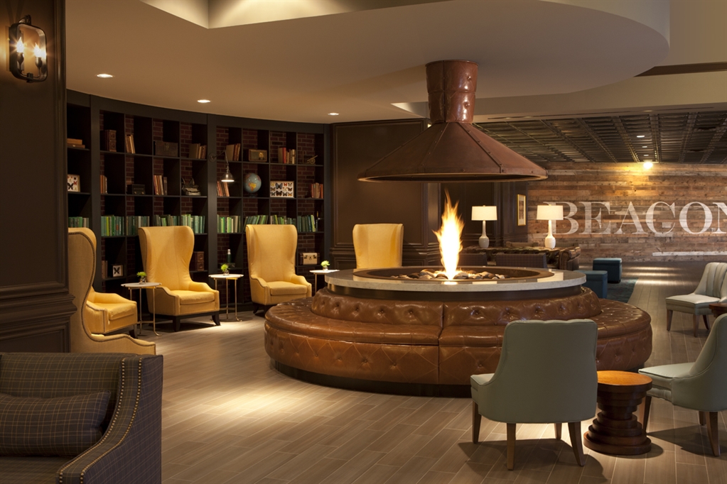 El Commons Hotel es el hotel de la University of Minnesota y, como muchos otros en Estados Unidos que siguen un esquema similar, presta especial atención al aspecto cultural y, como pueden ver en la imagen, crearon una biblioteca en la que el concepto "leer junto al fuego" es llevado a otro nivel