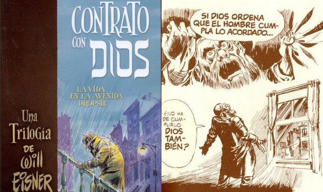 En 1978, después de algunos proyectos sin éxito como John Law o Shoeshine Boy, Eisner cambió la historia del cómic para siempre. Eisner ya era grande antes de su Contrato con Dios, pero su fuerza creadora no se detuvo. Ambientada en la Avenida Dropsie, Contrato con Dios es la primera novela gráfica publicada. Concebida como una trilogía, la fe, la pobreza, o la esperanza son temas centrales de la novela, que es además un canto contra el antisemitismo corrosivo que proliferó durante la depresión de los años 30 -la última obra de Eisner, La Conspiración, prologada por Umberto Eco, cuenta la historia secreta de Los Protocolos de los Sabios de Sión-. Eisner siempre tuvo un objetivo claro para los cómics, y Contrato con Dios fue la culminación del mismo: convertir los cómics en un producto para adultos. Posteriormente, adaptó obras clásicas a la novela gráfica, como el Quijote y Moby Dick, y continuó con su homenaje a la ciudad que le vio nacer con New York, la vida en la Gran Ciudad.