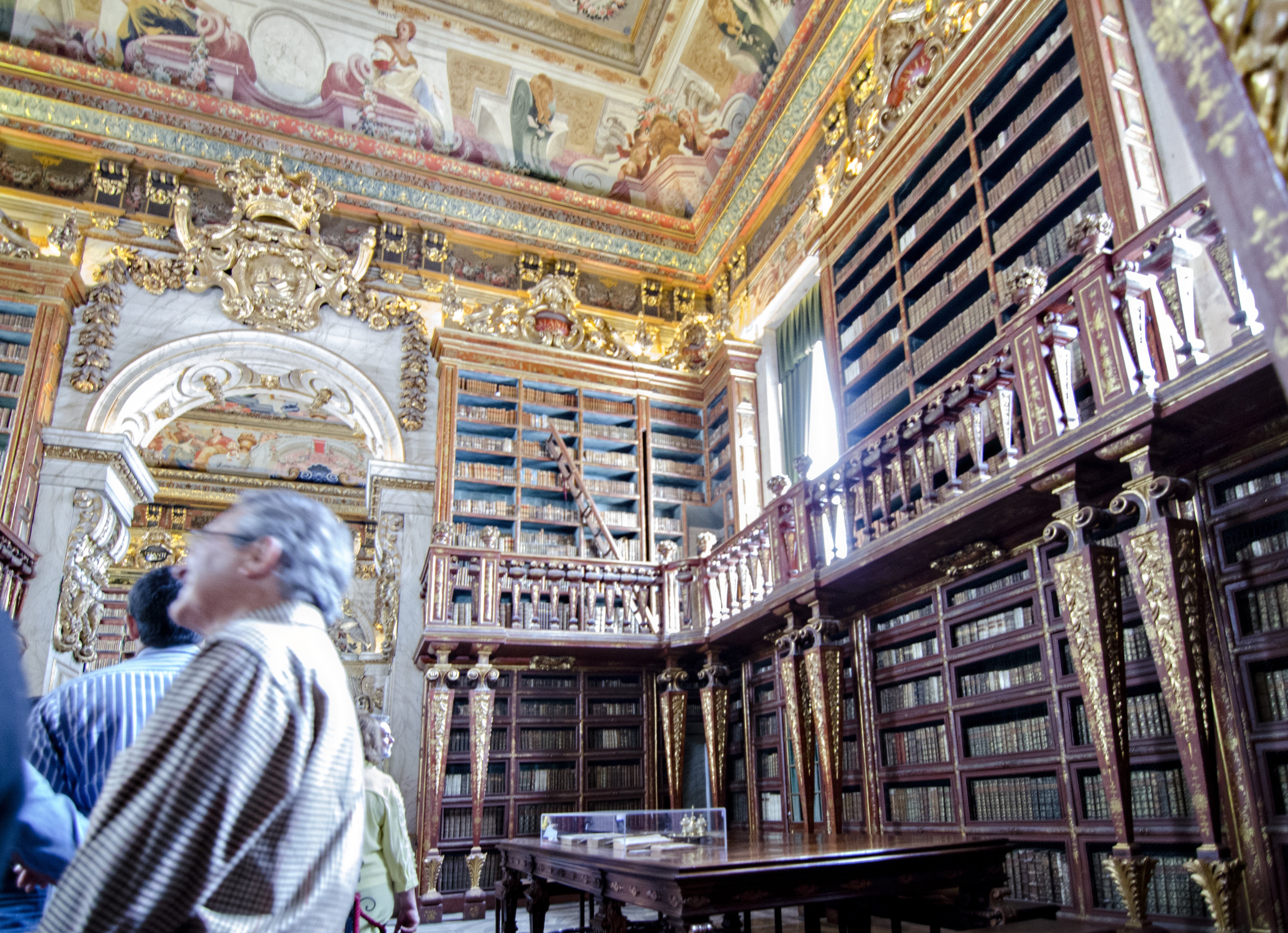 La rica decoración barroca interior, en la que robustas estanterías de madera exótica bañadas en oro ocupan las paredes, deja boquiabierto a cualquier visitante. Alberga unos 250.000 libros de los siglos XII al XIX, principalmente de Derecho, Filosofía y Teología. No sorprende que este edificio, declarado Monumento Nacional Portugués, sea el más visitado de Coimbra.