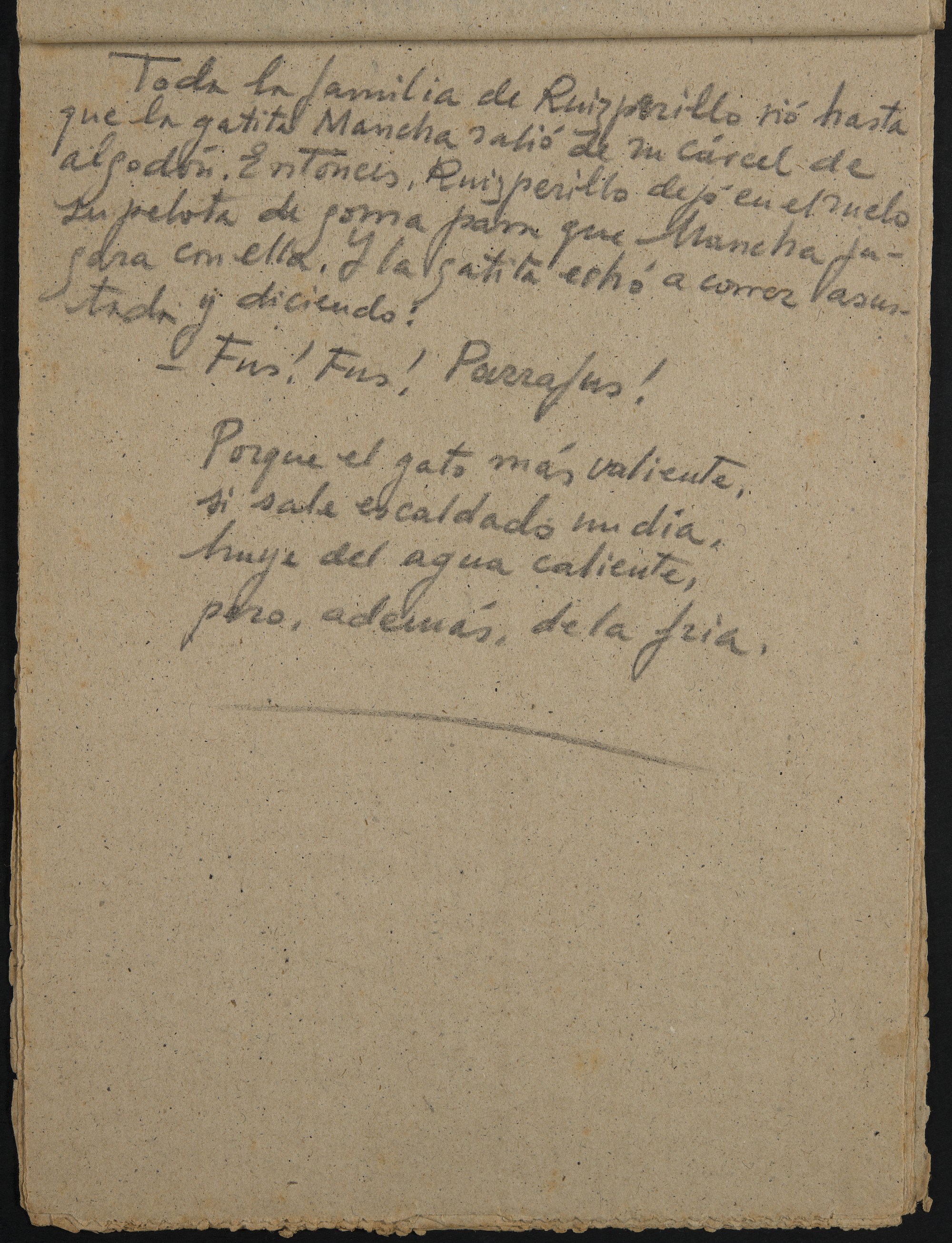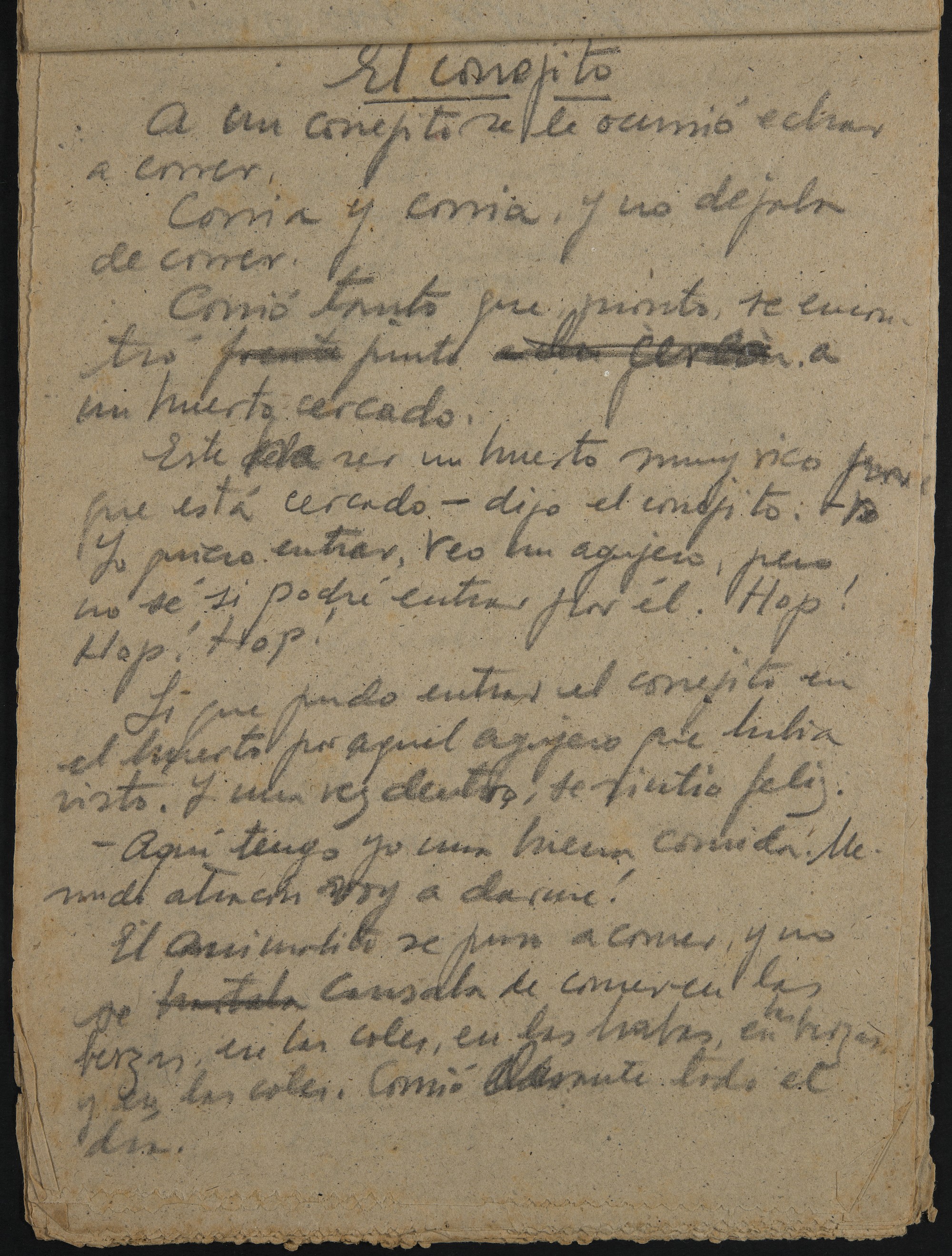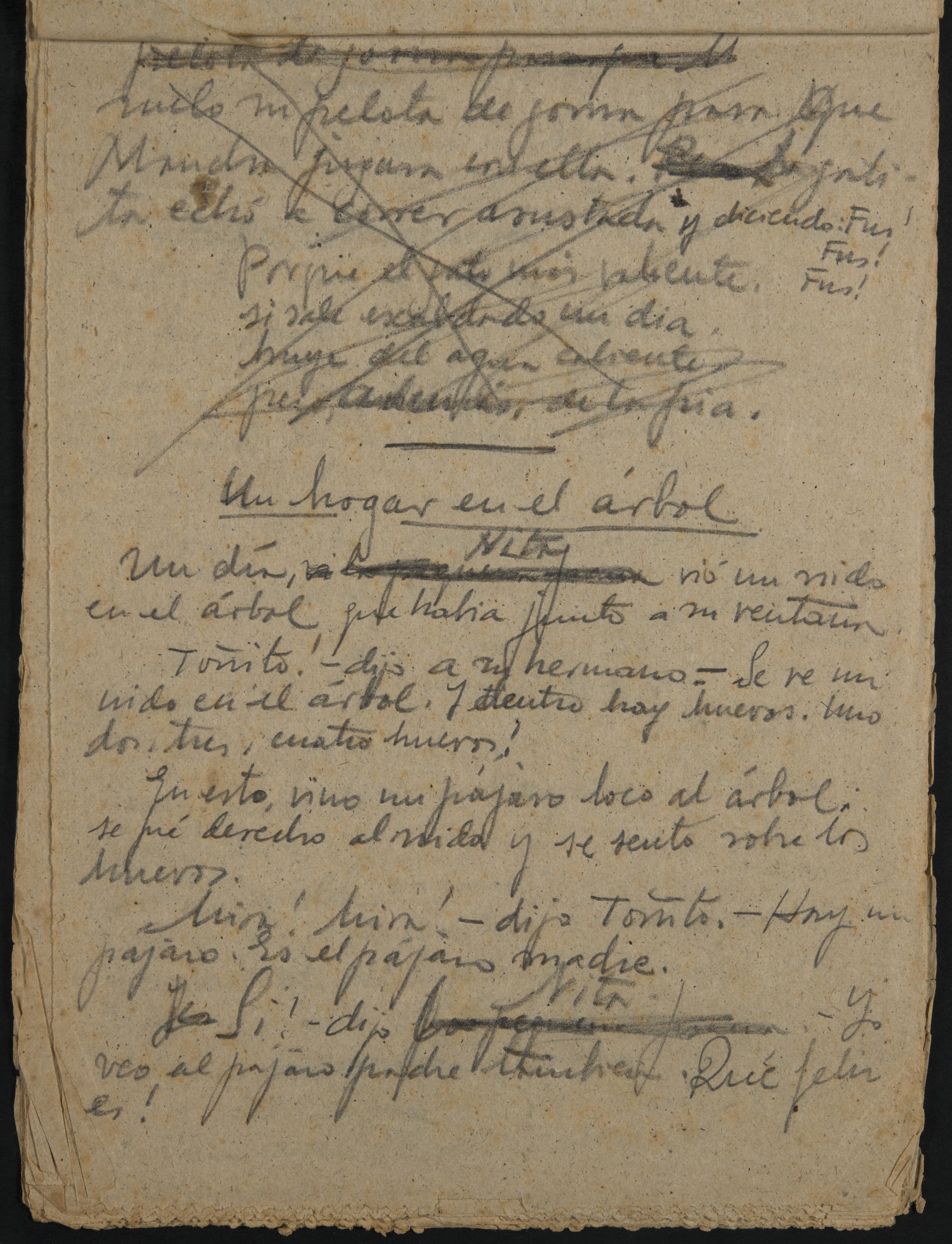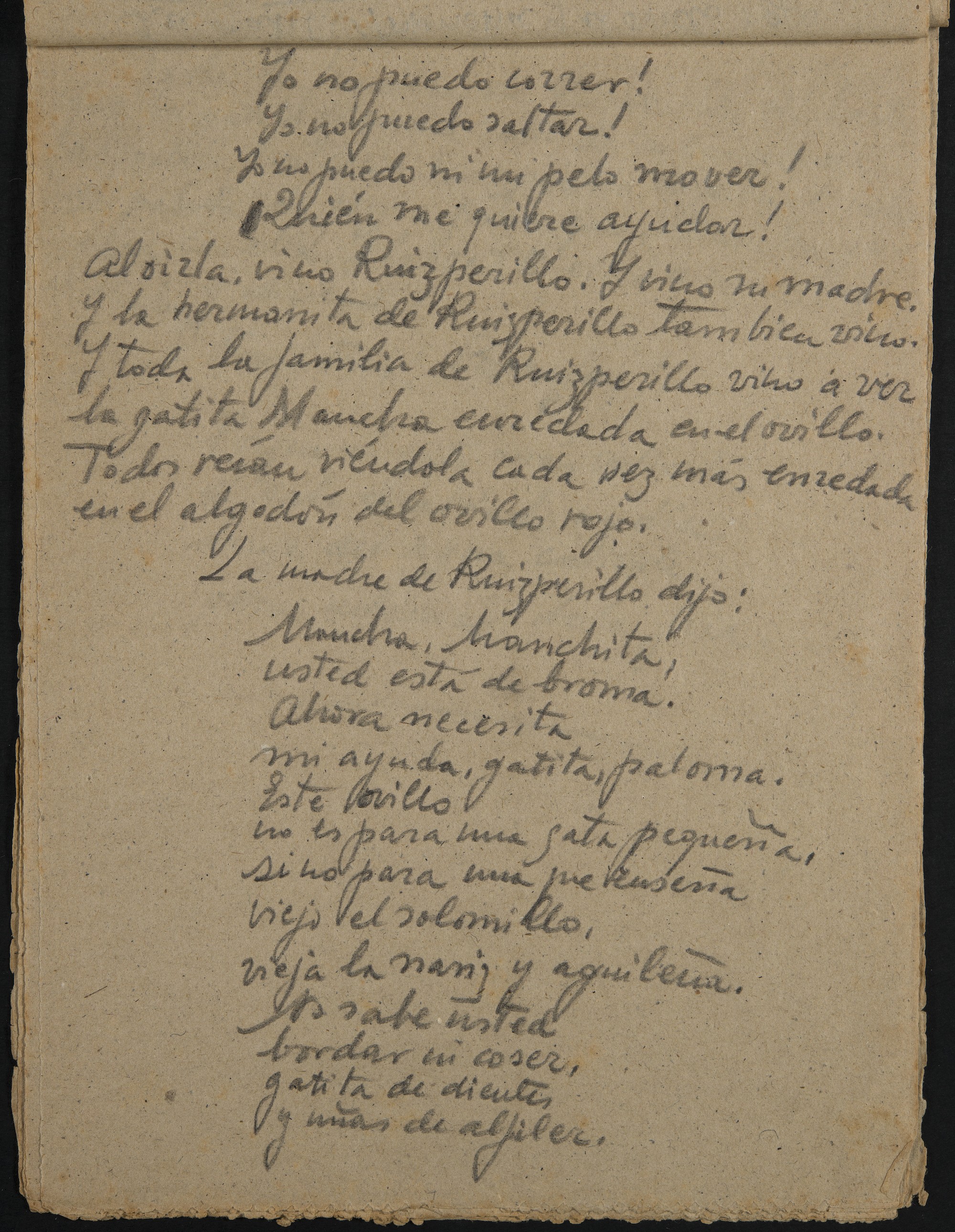 Fue lo último que Miguel Hernández (Orihuela, 1910 - Alicante, 1942) escribió desde la cárcel. Recluido en el Reformatorio de Adultos de Alicante, a donde llegó desde el Penal de Ocaña, el poeta solo tenía en mente a su mujer y su hijo. Fue para su pequeño Manuel Miguel para quien escribió El potro oscuro, El conejito, Un hogar en el árbol y La gatita Mancha y el ovillo rojo, cuatro relatos que perpetuó sobre seis pequeñas hojas de papel higiénico cosidas en su parte superior por un hilo de color ocre. Los guarda a buen recaudo la Biblioteca Nacional. La editorial Nordica los ha recopilado en Cuentos para mi hijo Manolito.