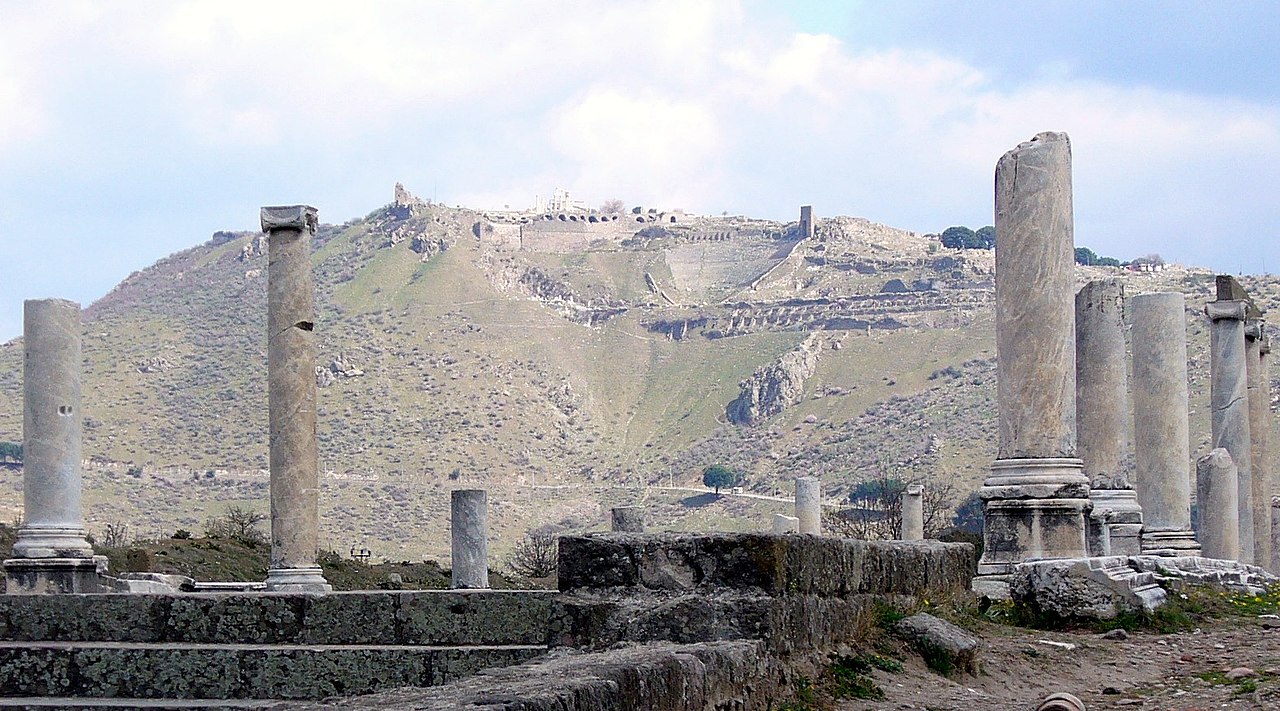 La Biblioteca de Pérgamo, construida en la actual Turquía, fue reunida por la dinastía atálida. Se considera la segunda mejor biblioteca helenística de la Antigüedad después de la de Alejandría. Se conoce su existencia principalmente gracias a Historia Natural, de Plinio el Viejo. Contenía sobre todo textos filosóficos copiados en pergaminos, unos 200.000 rollos. Saqueos reiterados y varios incendios acabaron con ella. En El nombre de la rosa, de Umberto Eco, se asegura que allí se custodiaron durante un siglo los manuscritos de Aristóteles, que no fueron publicados hasta que se trasladaron a Roma. Fotografía: La colina del castillo de la antigua Pérgamo en el que se encontraba la biblioteca