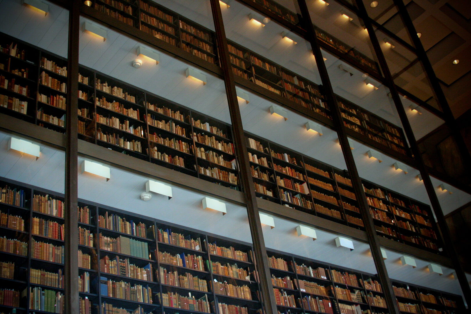 Fue construida por el arquitecto estadounidense Gordon Bunshaft en la década de los 60 del siglo pasado. Sus seis pisos de altura –más una planta excavada a 15 metros– se levantan imponentes en una fachada sin ventanas, construida con paneles de mármol tensados por una cuadrícula de hormigón que dejan pasar una luz de baja intensidad por sus vetas, dotando al espacio de una sutil atmósfera ámbar. Una estantería de cristal cerrada herméticamente al vacío actúa de segunda protección. La parte superior guarda 180.000 volúmenes y la subterránea supera el millón.
