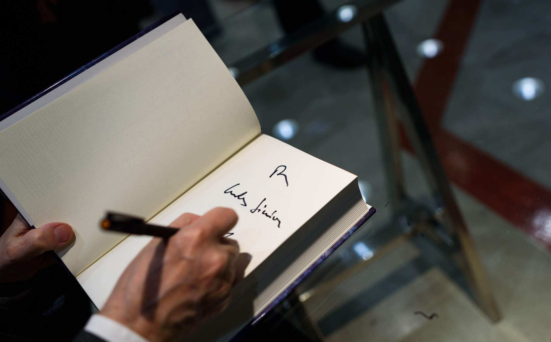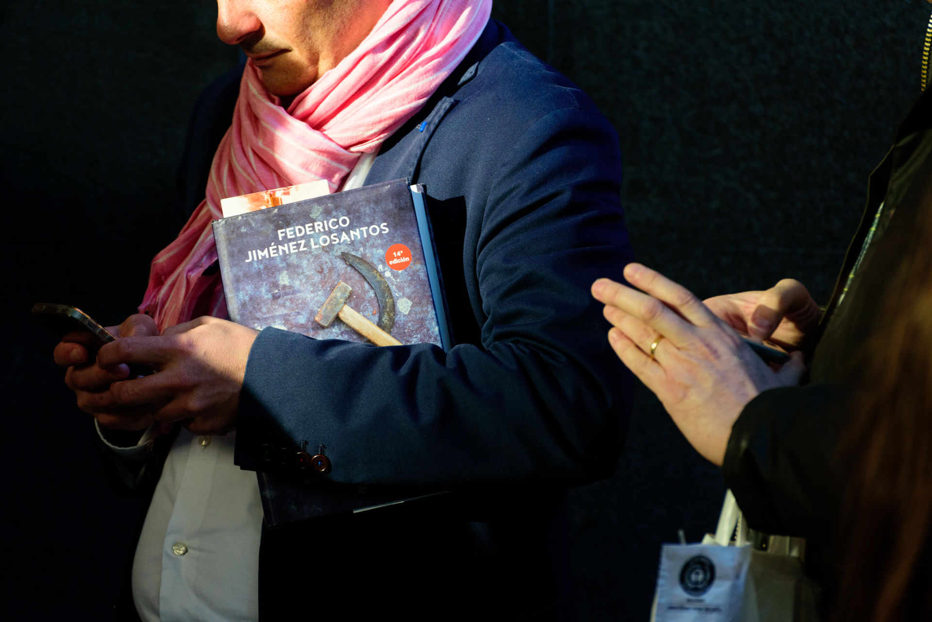 Un hombre sujeta su ejemplar del libro Memoria del Comunismo mientas espera su turno para la firma.
