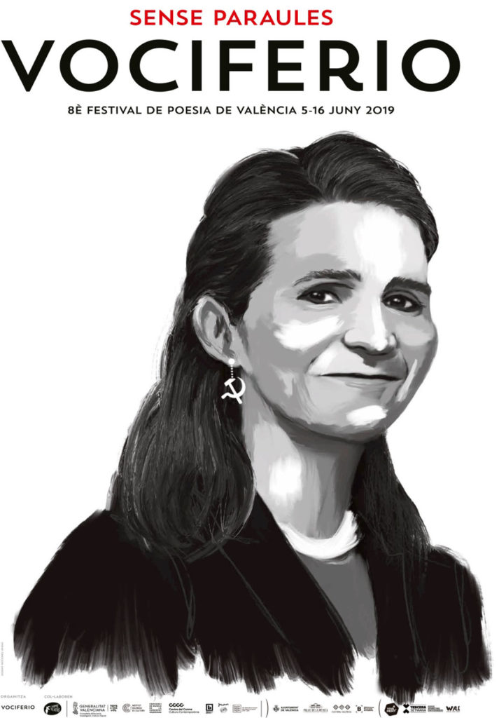 La octava edición del Festival de Poesía de Valencia Vociferio, un evento literario que cuenta con el patrocinio de las instituciones públicas de la comunidad, ha decidido usar un cartel promocional bastante polémico. En él, aparece un dibujo de la infanta Elena hiperrealista, en blanco y negro. Hasta aquí todo bien, pero la hermana del rey lleva puesto un adorno comunista. En concreto, luce un pendiente con la hoz y el martillo.