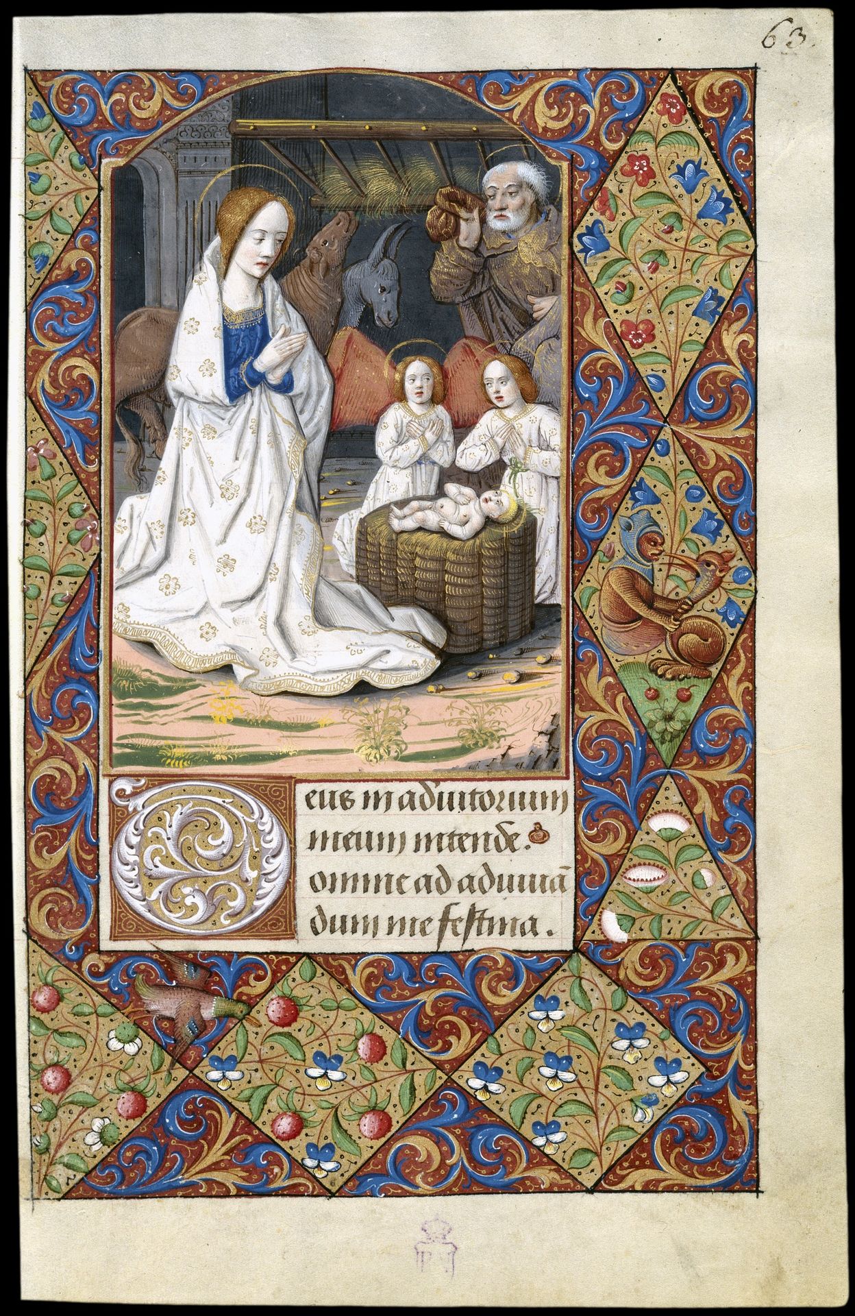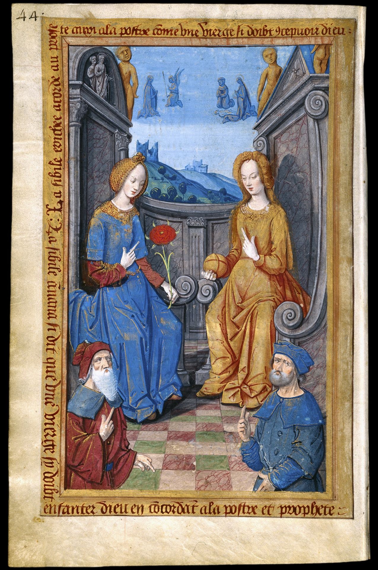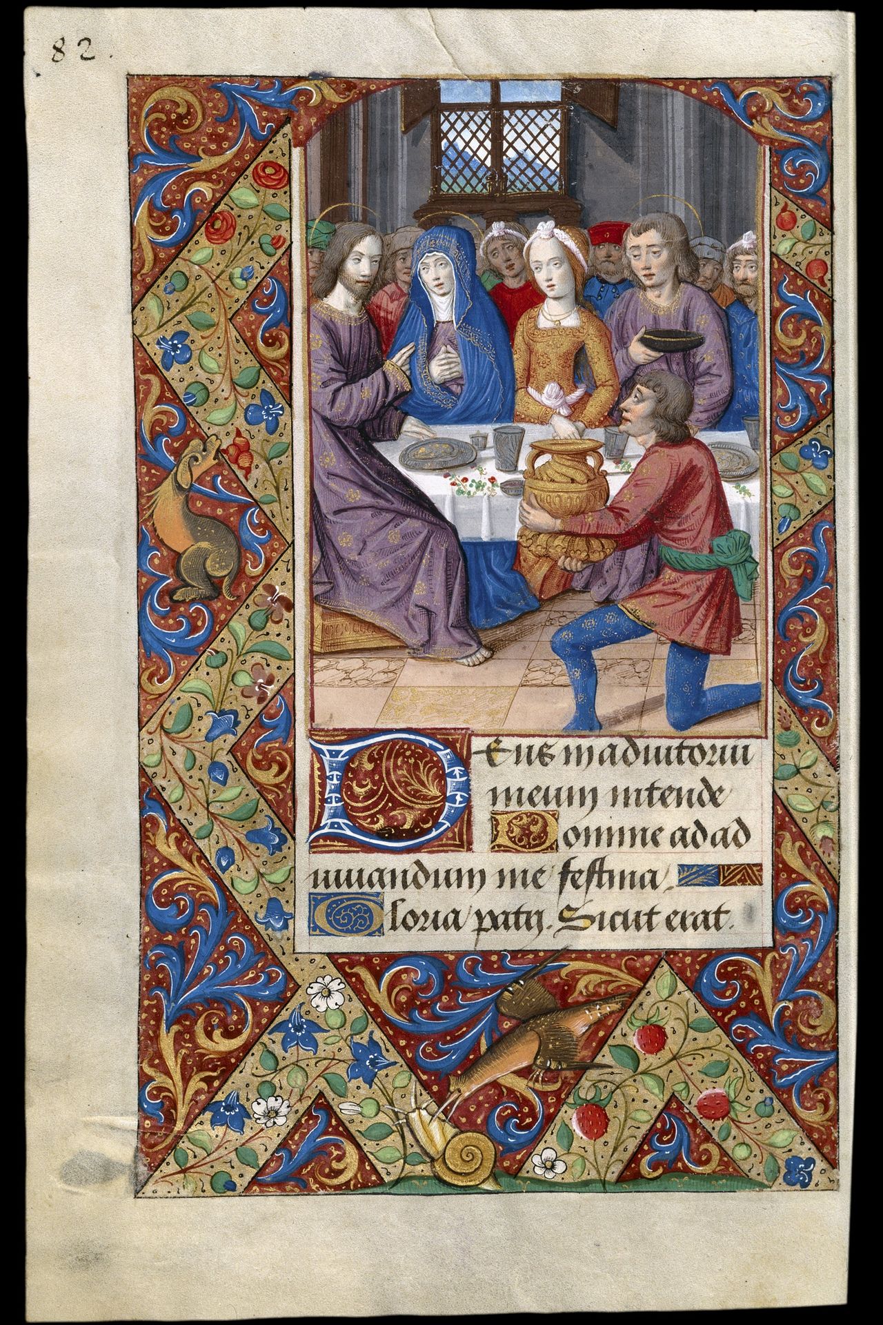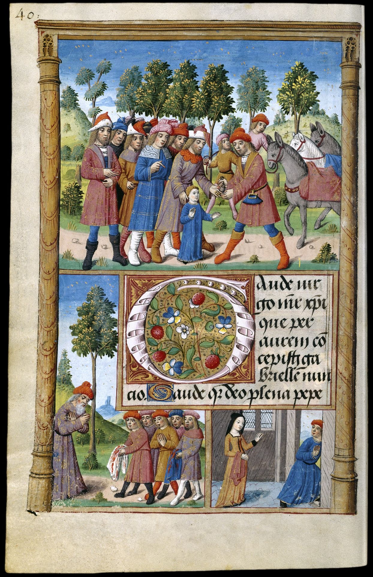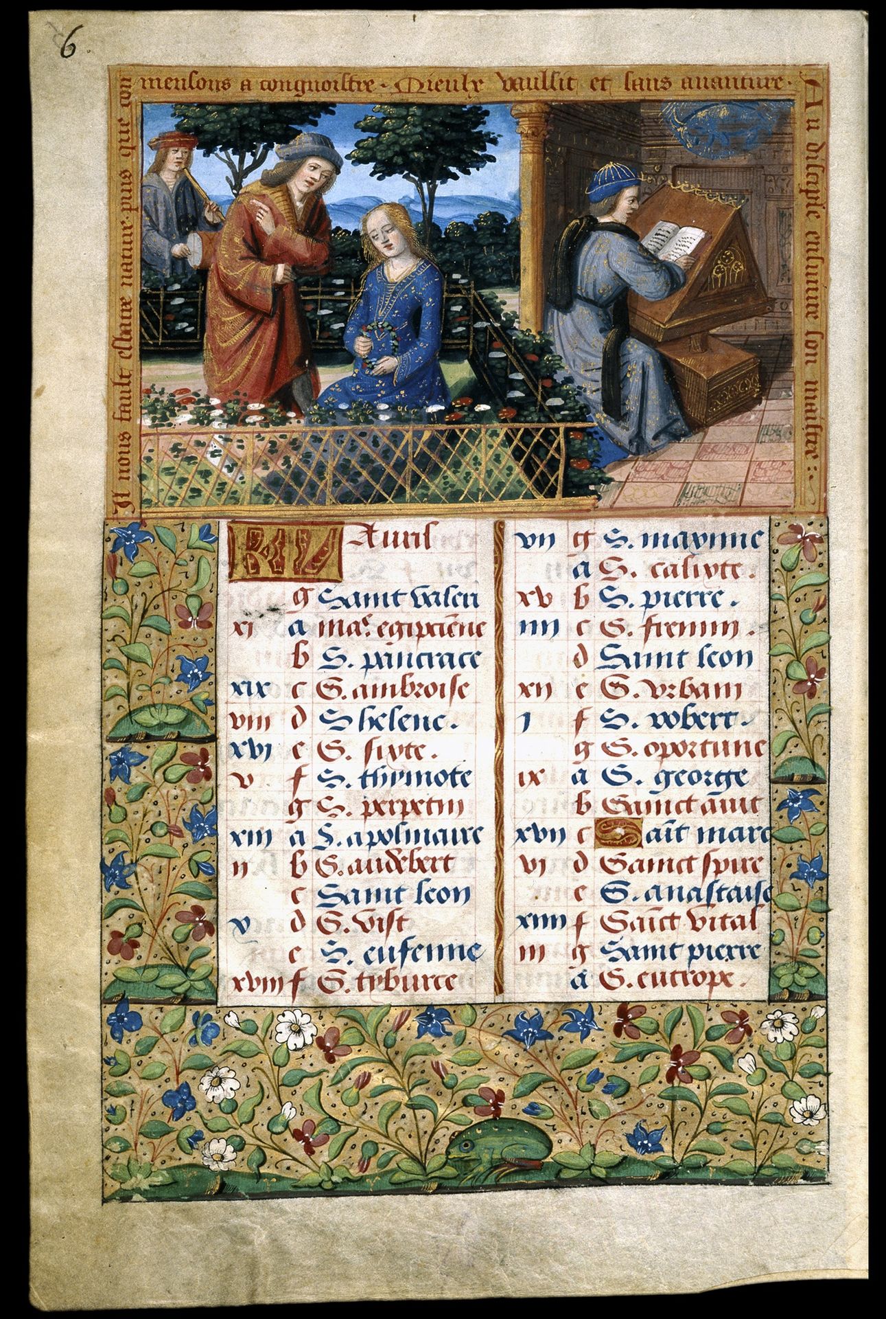 Comienza con un calendario, ilustrado de forma singular ya que, junto a los ciclos habituales con los signos del zodiaco y los trabajos de los meses, se desarrolla la historia de dos hermanos, uno bueno y piadoso, que terminará por ascender al cielo, y otro disoluto y lujurioso que acabará sus días en el infierno.