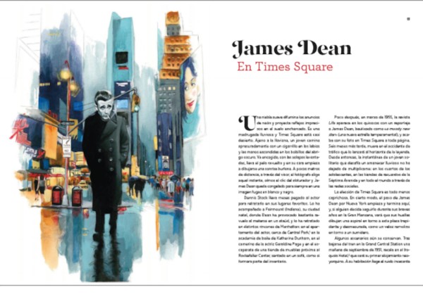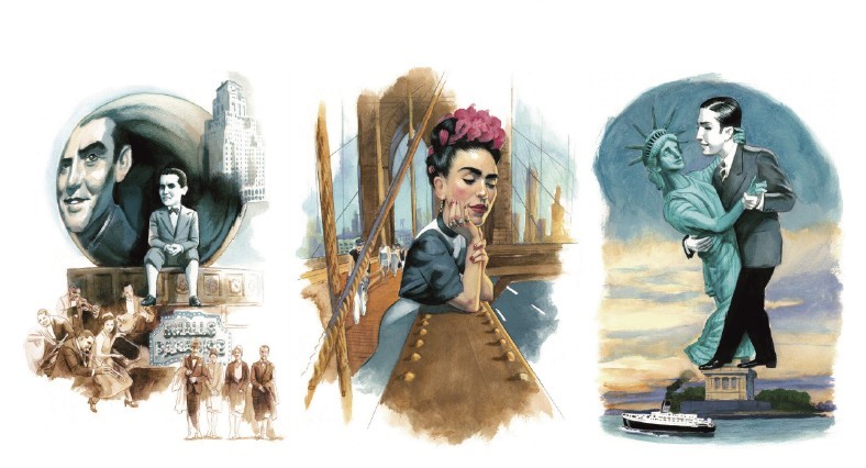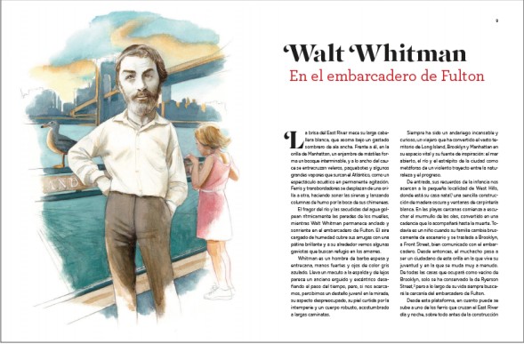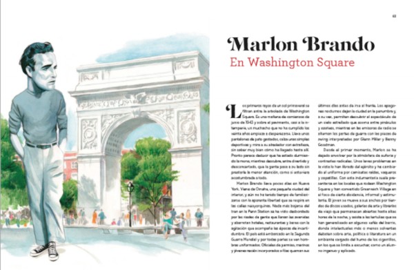 Hay muchas novelas en las que una ciudad se revela como un personaje más. Tan crucial que la trama no avanzaría sin su presencia. Así se abre paso Nueva York, alacena de sueños rotos para unos, fuerza motriz para otros. La Gran Manzana es un muestrario de seres, razas y pensamientos que pululan entre gigantescos rascacielos que se asoman al océano. Miles de historias de anónimos han tejido sus raíces y alimentado su extracto. También literatos, cineastas, actores y músicos se dejaron seducir por la "energía creativa" que irradia la metrópoli: Federico García Lorca, Houdini, Marilyn Monroe, Frida Kahlo, John Lennon... Todos estos personajes, ya desaparecidos, se relacionaron con Nueva York como con un organismo vivo en constante transformación. A ellos va dedicado Espíritus de Nueva York (Lunwerg Editores), escrito por Alberto Gil e ilustrado con muchísimo gusto por Fernando Vicente Sánchez.