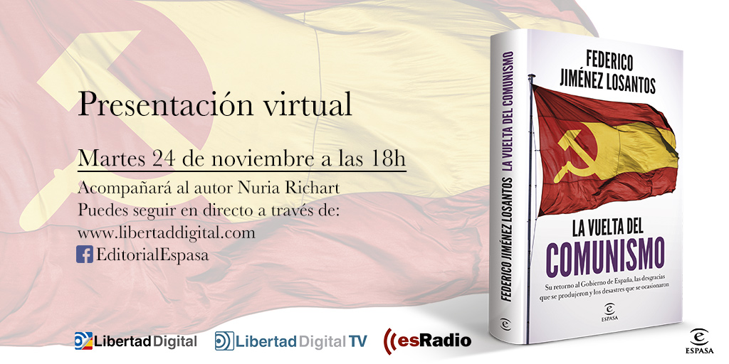 La presentación virtual del libro será el martes 24 de noviembre a las 18:00 horas. Se podrá seguir en streaming a través de la página de Facebook de la editorial Espasa (pinchando aquí) o del periódico Libertad Digital. En la presentación acompañará al autor Nuria Richart.