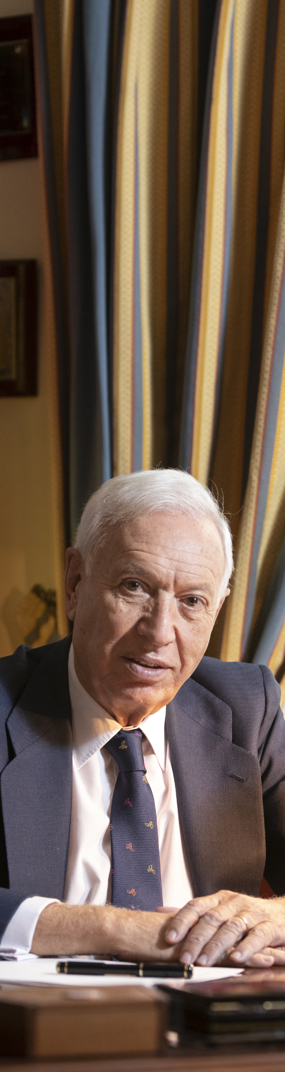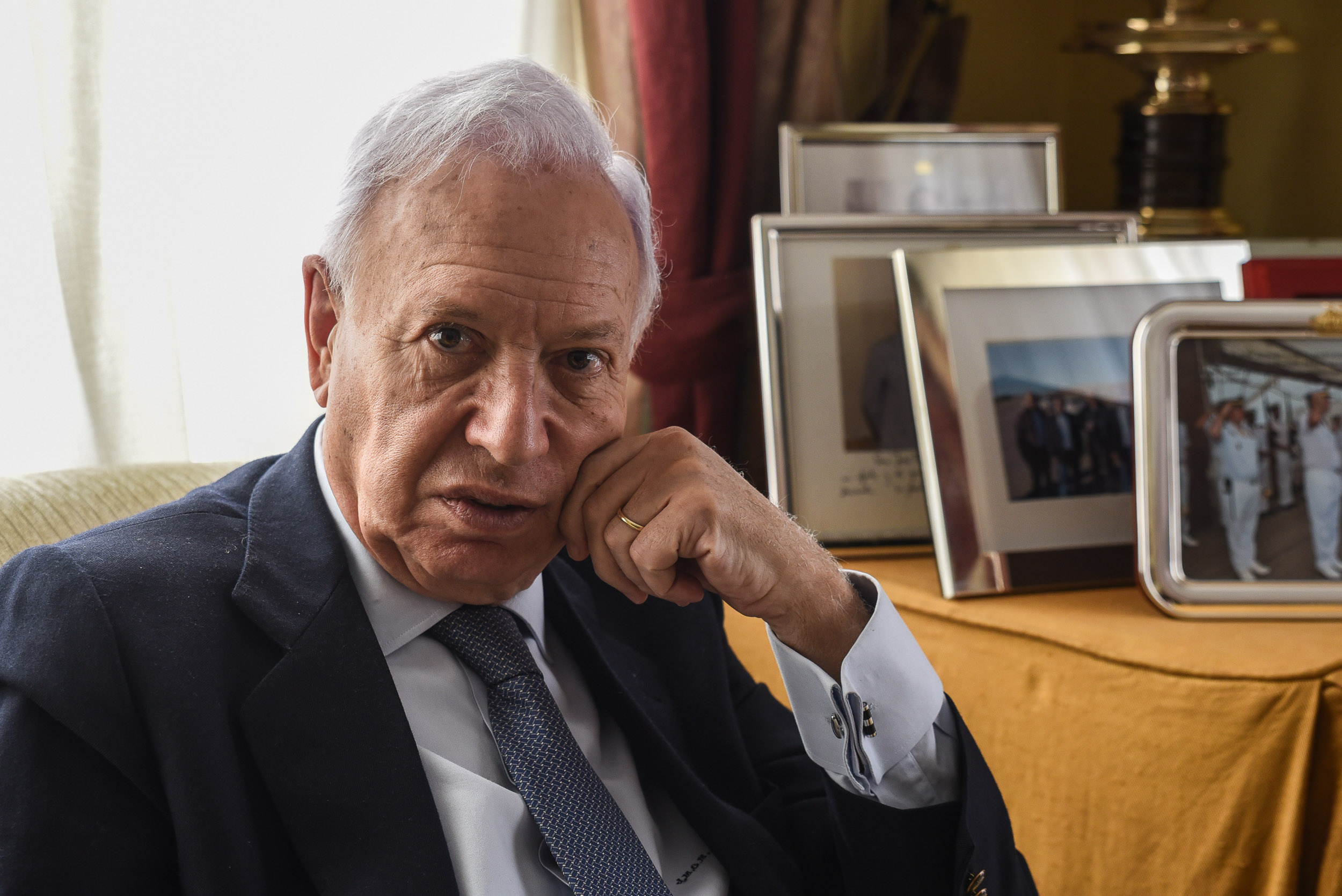 La casa de José Manuel García-Margallo es una de esas en las que muchísimas cosas y docenas de fotografías hablan de una vida larga y llena de acontecimientos e hitos. Su despacho, con un aire decimonónico y un viejo retrato de un antepasado, tiene estanterías rebosantes de libros y de más objetos exóticos e históricos y una vitrina sobre la puerta agrupa una veintena de medallas de significado completamente desconocido para el que esto escribe.