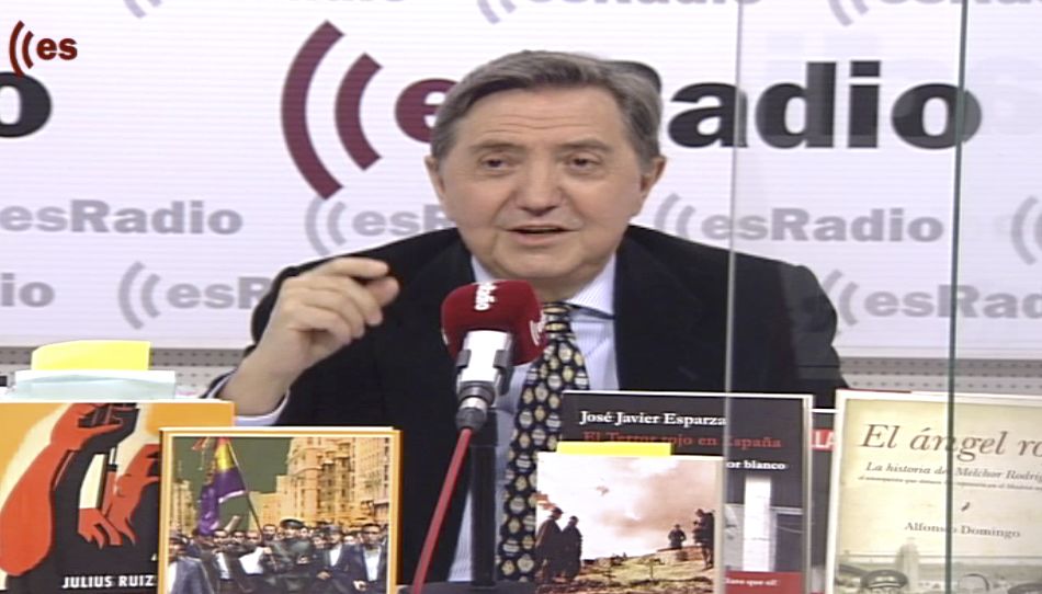 "Estos son algunos de los libros que estarán prohibidos si se aprueba la ley de Memoria llamada democrática, que es la censura sobre nuestra memoria". Así de contundente ha arrancado su editorial de las siete Federico Jiménez Losantos. A su alrededor, una decena de libros acerca de las matanzas de Paracuellos, ahora que se cumplen 85 años de aquellos asesinatos. "Nunca ha habido una ley prohibiendo una manera de recordar determinada. Se podía prohibir la expresión del recuerdo, pero no el recuerdo mismo". Y ha añadido que "prohibir el recuerdo verdadero de lo que fue la Guerra Civil es criminal".
