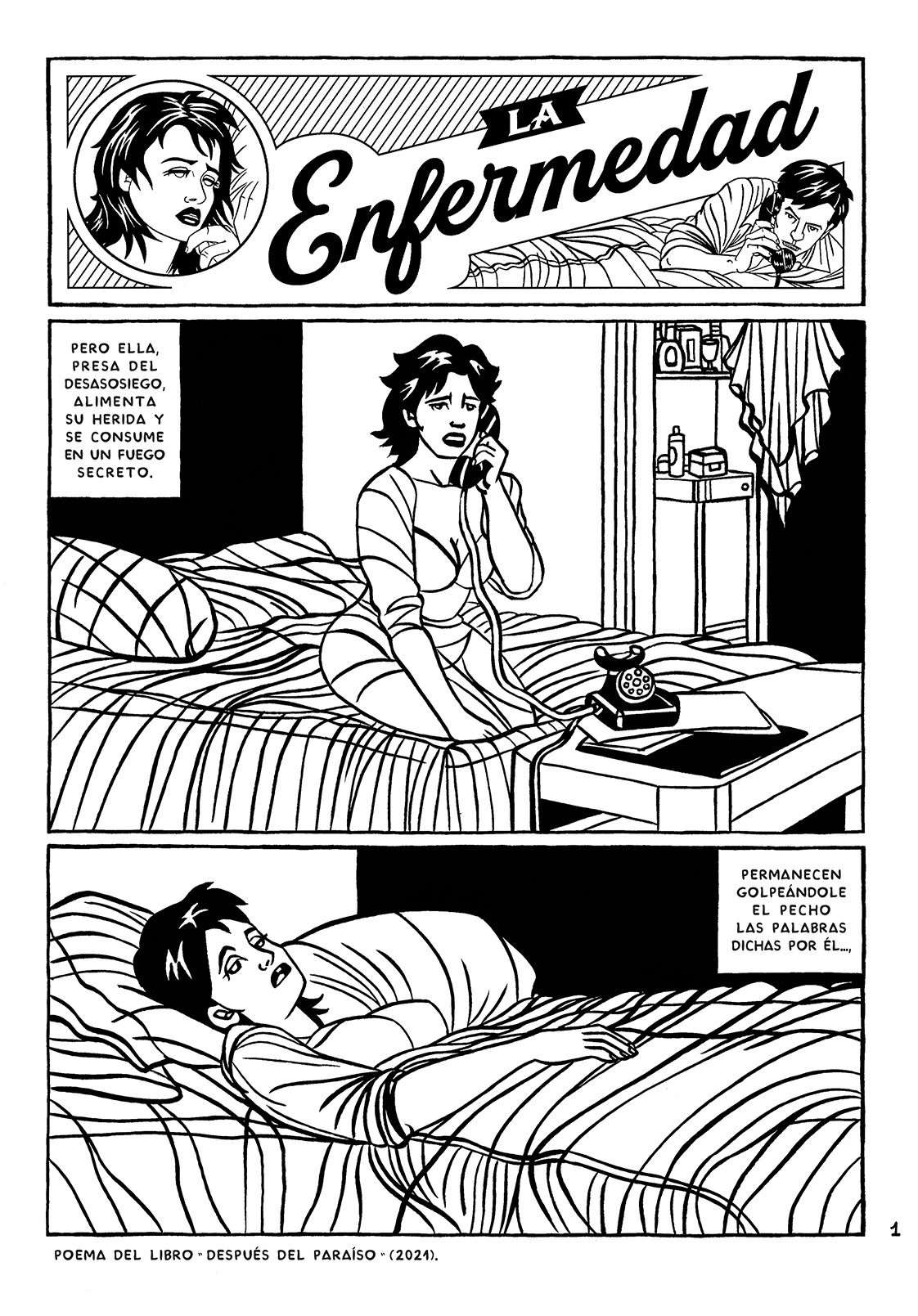 Viñetas de plata era más terrorífico, desde luego. "Es lógico, teniendo en cuenta que uno de sus temas era el horror", explica ella. Vive la vida apunta hacia otro lado, empezando por el poema que le da título, y que incita precisamente a disfrutar la existencia, da igual que uno se encuentre "en esos barrios pobres hechos para la droga o el desahucio", o "en los grises palacios de los ricos". De todas sus adaptaciones, la dibujante se queda con tres. "De Vive la vida me gusta mucho El hombre menguante, por el humor", dice. "Luis Alberto es uno de los poetas que trata con mayor elegancia el humor. Y yo creo que hay que defender el humor en las artes". También se siente muy satisfecha de La enfermedad, una serie de dibujos que ilustran un poema sobre un amor dramático y no correspondido que, para más inri, es también el favorito de Luis Alberto de Cuenca. De Viñetas de Plata, por su parte, se queda con La mujer sin cabeza, "porque es muy cinematográfico. Un guión de cómic, tal cual". Un poema elegante y truculento a partes iguales, que a ella le sirve para definir la esencia del poeta que mejor se adapta al género. "Luis Alberto es el poeta español más tebeístico. No sólo porque reivindique los tebeos, sino porque su poesía, tan clara y tan narrativa, está muy influenciada por ellos".