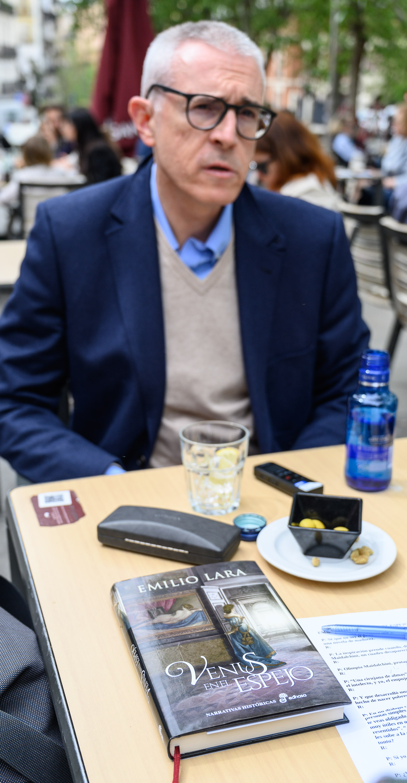 Emilio Lara (Jaén, 1968) se zambulle en la Italia hermosa, dura y cuasi española del siglo XVII en su última novela, Venus en el espejo (Edhasa, 2023). Olimpia Maidalchini, la cuñada de Inocencio X, es la médula espinal del libro. Los lectores habituales de este doctor en Antropología comprobarán que es el personaje mejor tallado, el mejor acabado de toda su bibliografía. En torno a este Sol femenino, cálido e hirviente, orbitan, entre otros planetas, el citado pontífice o el propio Velázquez; en torno al pintor español, la modelo y pintora Flaminia Triunfi. En realidad, el propósito innegociable del escritor pasaba por narrar la aventura del genio sevillano con la joven italiana. Y lo hace en una obra de madurez, solidísima, contenida, libre de farfollas, tan amable como dura. Contradiciendo a los presentistas, ergo hablando del presente utilizando elementos del pasado. LD le entrevista en una terraza de Alonso Martínez, mientras nos acecha una señora emperifollada que amenaza con vendernos una exclusiva sobre Emiliano Revilla.
