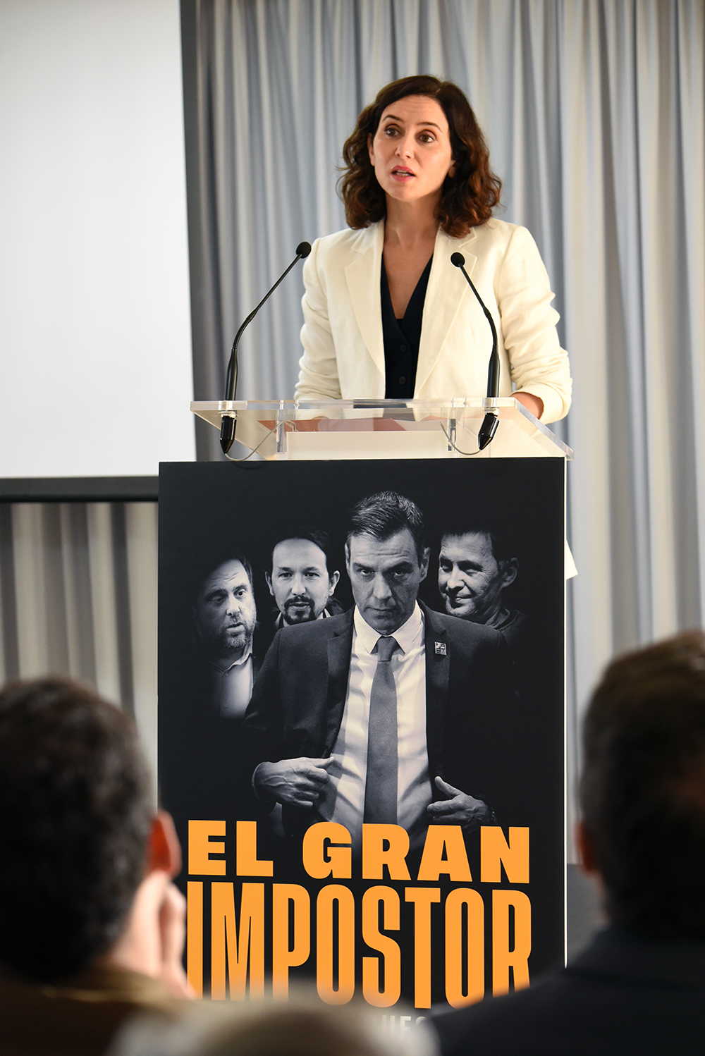 Isabel Díaz Ayuso y Carlos Cuesta en la presentación en Madrid del libro 'El Gran Impostor', en el Círculo de Bellas Artes.