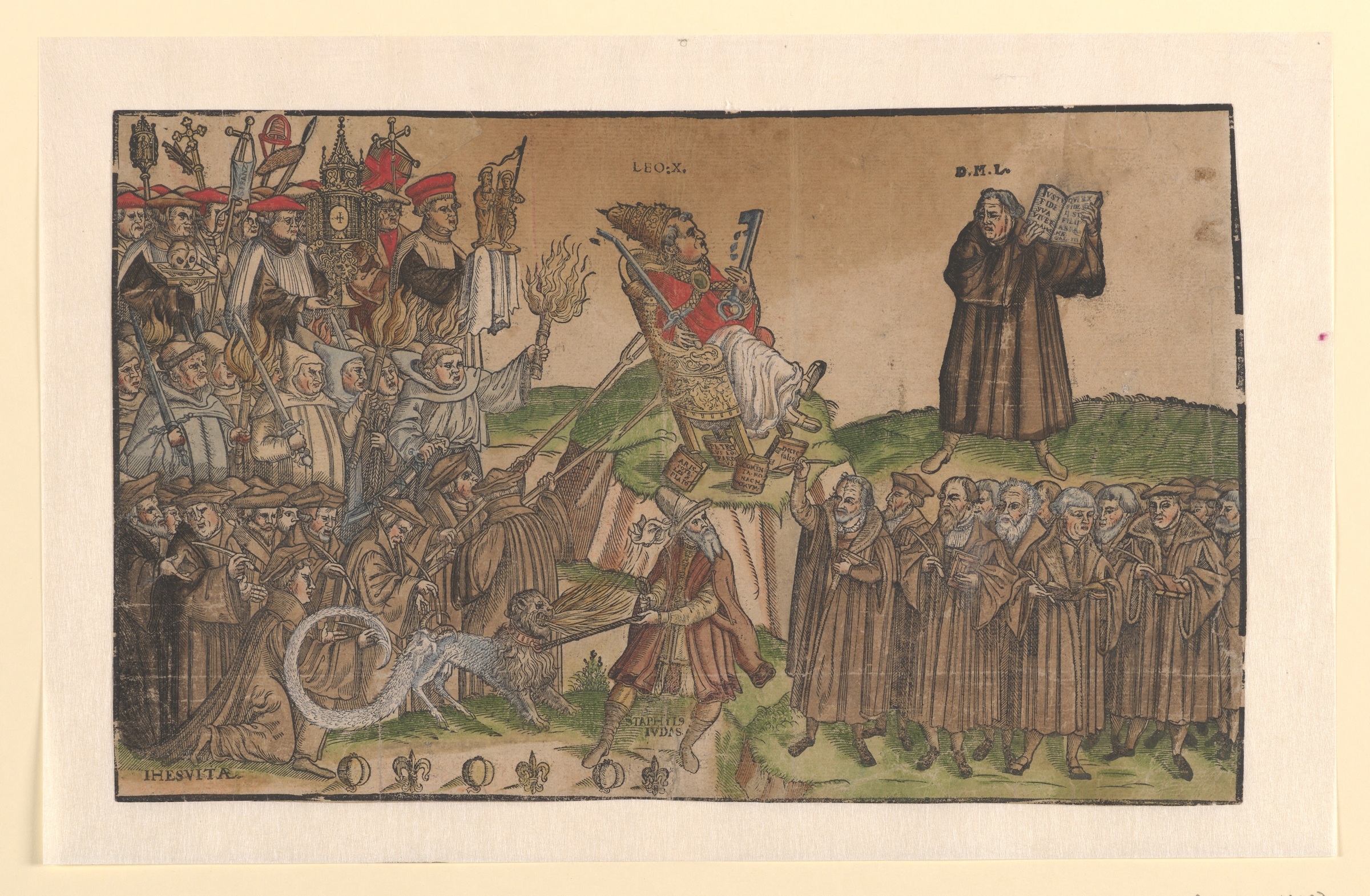 En la eficaz propaganda protestante, fueron frecuentes las imágenes que oponían a Lutero y al Papa o a la nueva Iglesia reformada y la vieja Iglesia de Roma. En este grabado en madera, la silla del pontífice se tambalea y anticipa su caída, a pesar del apoyo de los suyos, frente a un Lutero triunfante. | Lutherus Triumphans, 1568. Xilografía coloreada, Augsburg, Städtische Kunstsammlungen, Inv.Nr. G 18372.