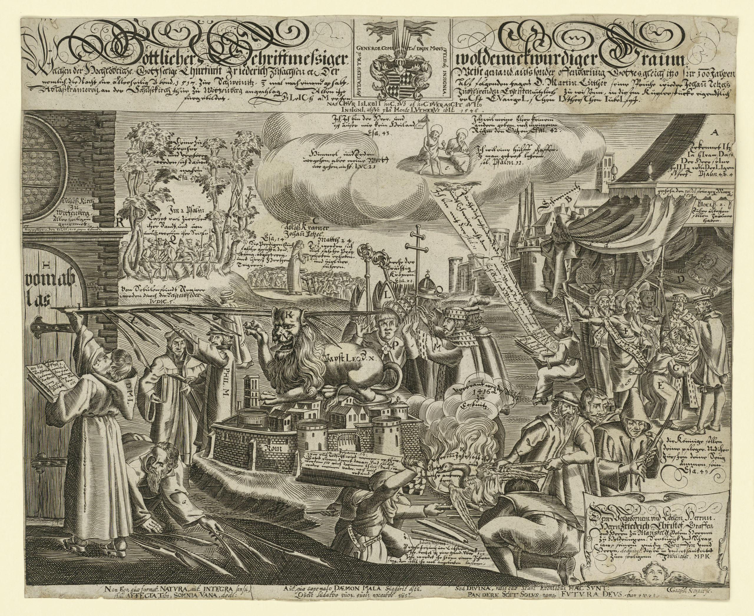 Este grabado refiere un sueño del príncipe elector Federico de Sajonia durante la noche del 30 de octubre de 1517. Federico sueña que un monje escribe en la puerta de la iglesia de Wittenberg con letras tan grandes que se leen desde su castillo: el extremo de su pluma llega hasta Roma, atraviesa los oídos de un león y hace tambalearse la tiara papal. / Conrad Grale, Göttlicher, Schriftmessiger, woldernnckwürdiger Traum..., Leipzig, Johann Glück, 1617. Kupferstichkabinett, Staatliche Museen zu Berlin, S-AM 5-2017.