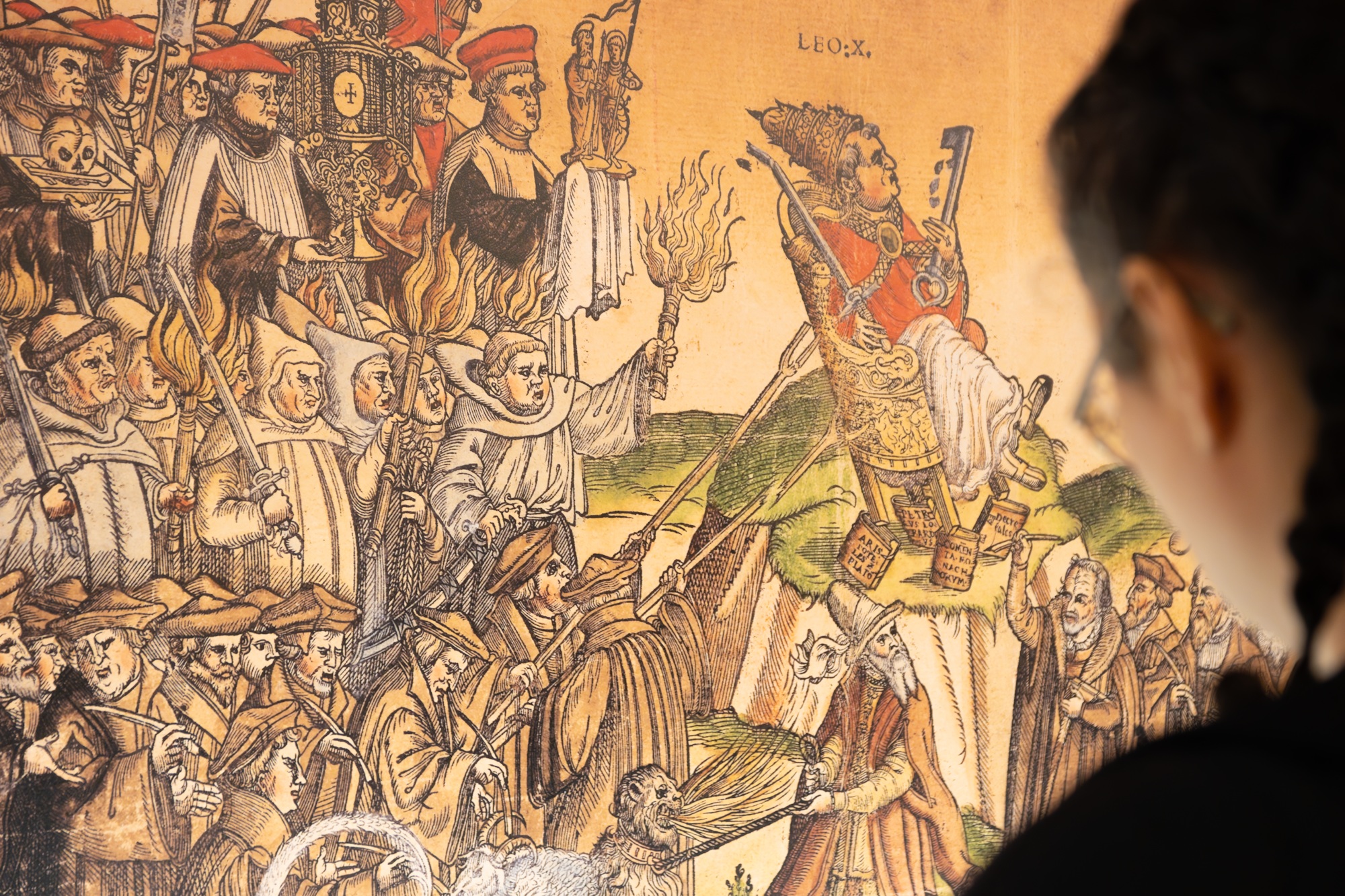 La primera parte de la muestra está dedicada a la expansión fulgurante del luteranismo, a lo que dio en llamarse la “tempestad de los herejes” y su “sed de tinta”, y a los usos de la imprenta para la propaganda y la controversia religiosas.