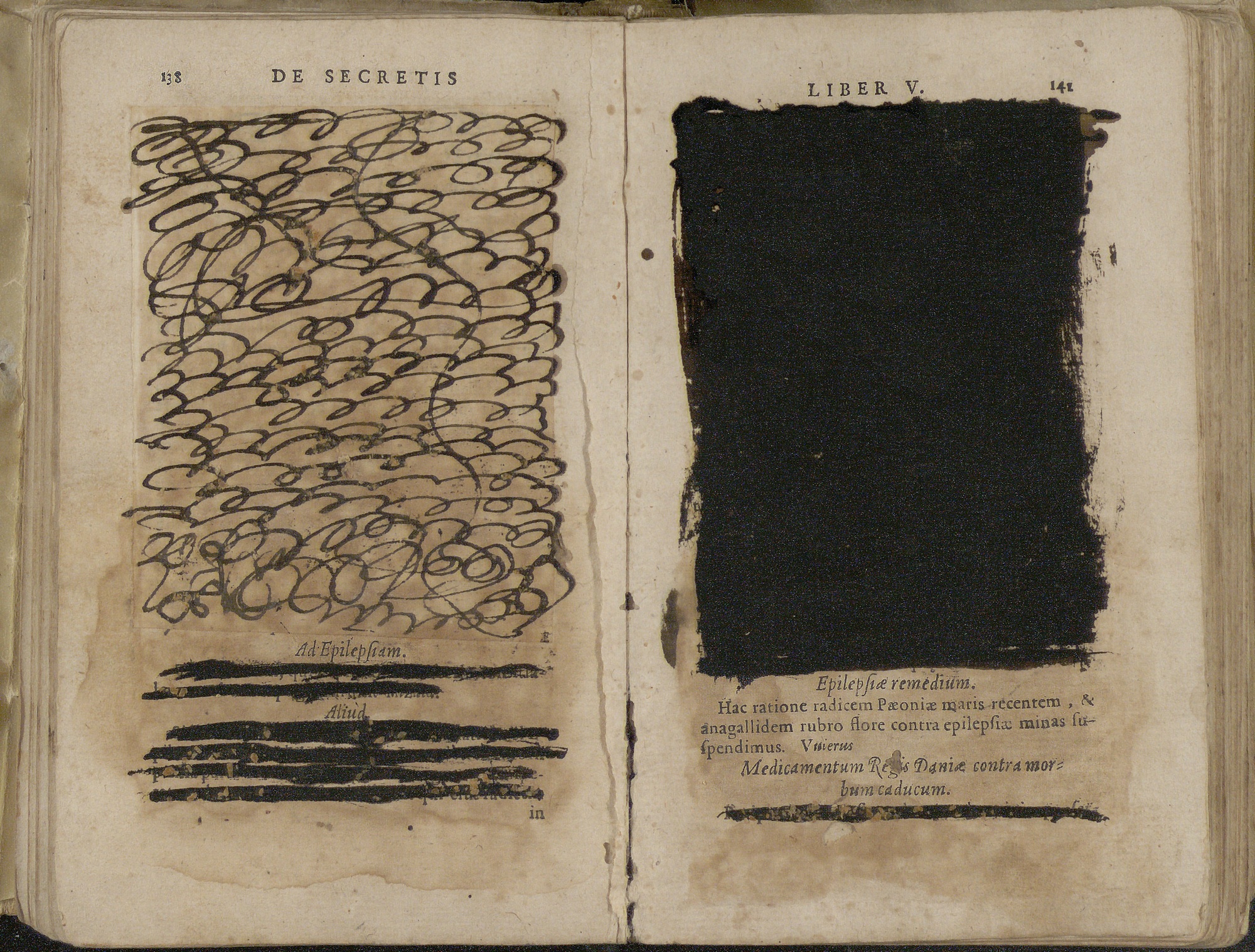 Las páginas expuestas muestran las cicatrices y tachaduras de libros prohibidos y más tarde expurgados. | Johann Jacob Wecker, De secretis libri XVII ex varijs authoribus collecti, methodiceque digesti, Basileae, ex Officina Pernea, 1592. BG/35925.