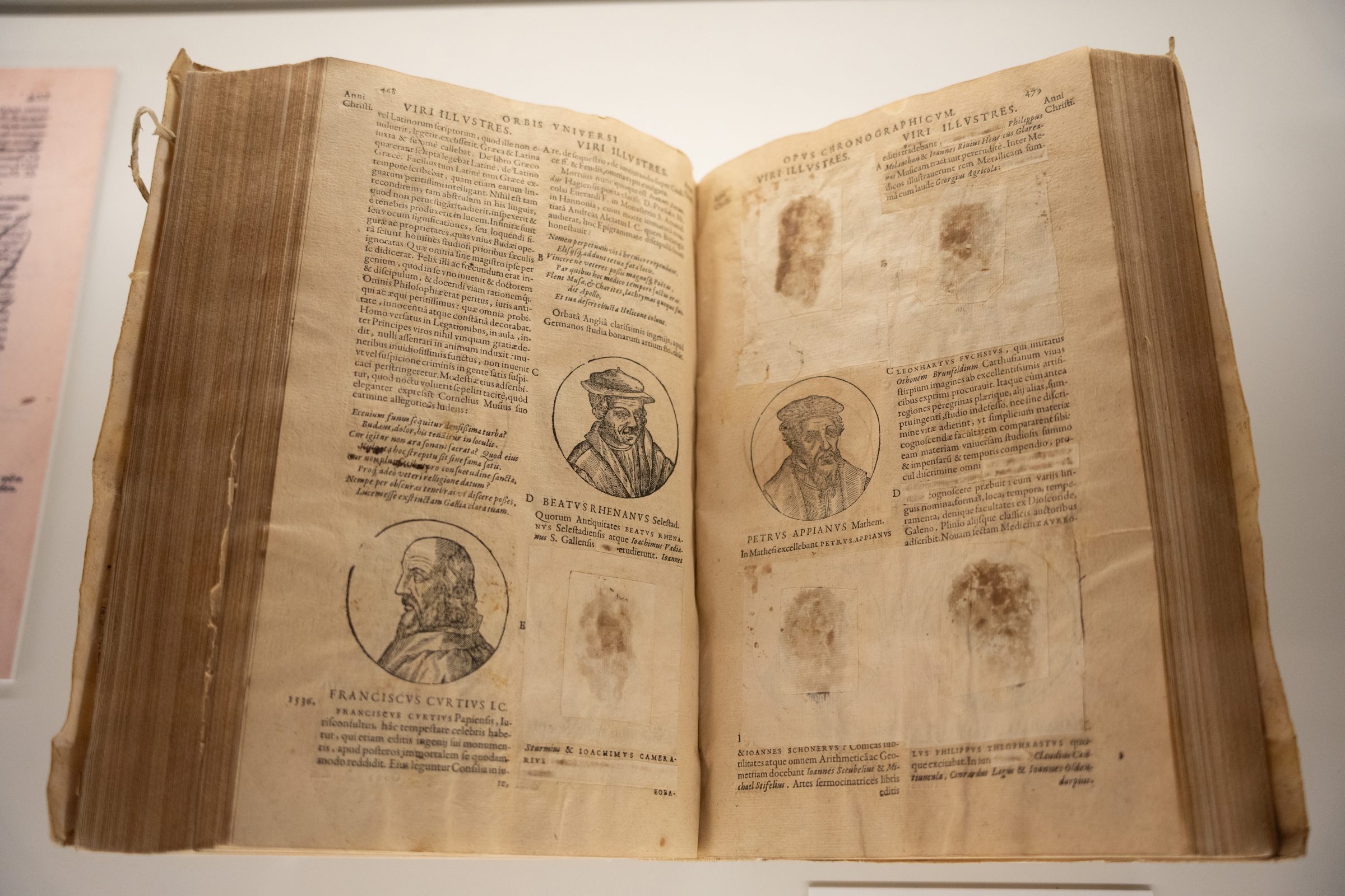 Ejemplar expurgado según el índice de Sandoval, que prescribe la eliminación de doce retratos de autores protestantes o considerados peligrosos o discrepantes. | . Pieter van Opmeer, Opus chronographicum orbis vniuersi a mundi exordio vsque ad annum MDCXI continens historiam, icones et elogia summorum pontificum, imperatorum, regum ac virorum illustrium, Antuerpiae, ex typographeio Hieronymi Verdussij, 1611. BG/9563.
