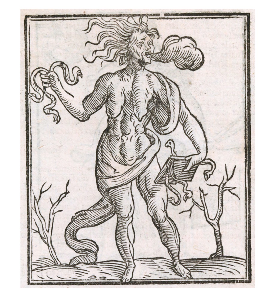 La Iconologia (1603) de Cesare Ripa, representa el concepto de Herejía con los atributos del libro abierto y el áspid. Finge Ripa una anciana desnuda, con los pechos secos, cuya mano izquierda sostiene un libro del que nacen serpientes, que recoge y esparce con la derecha.