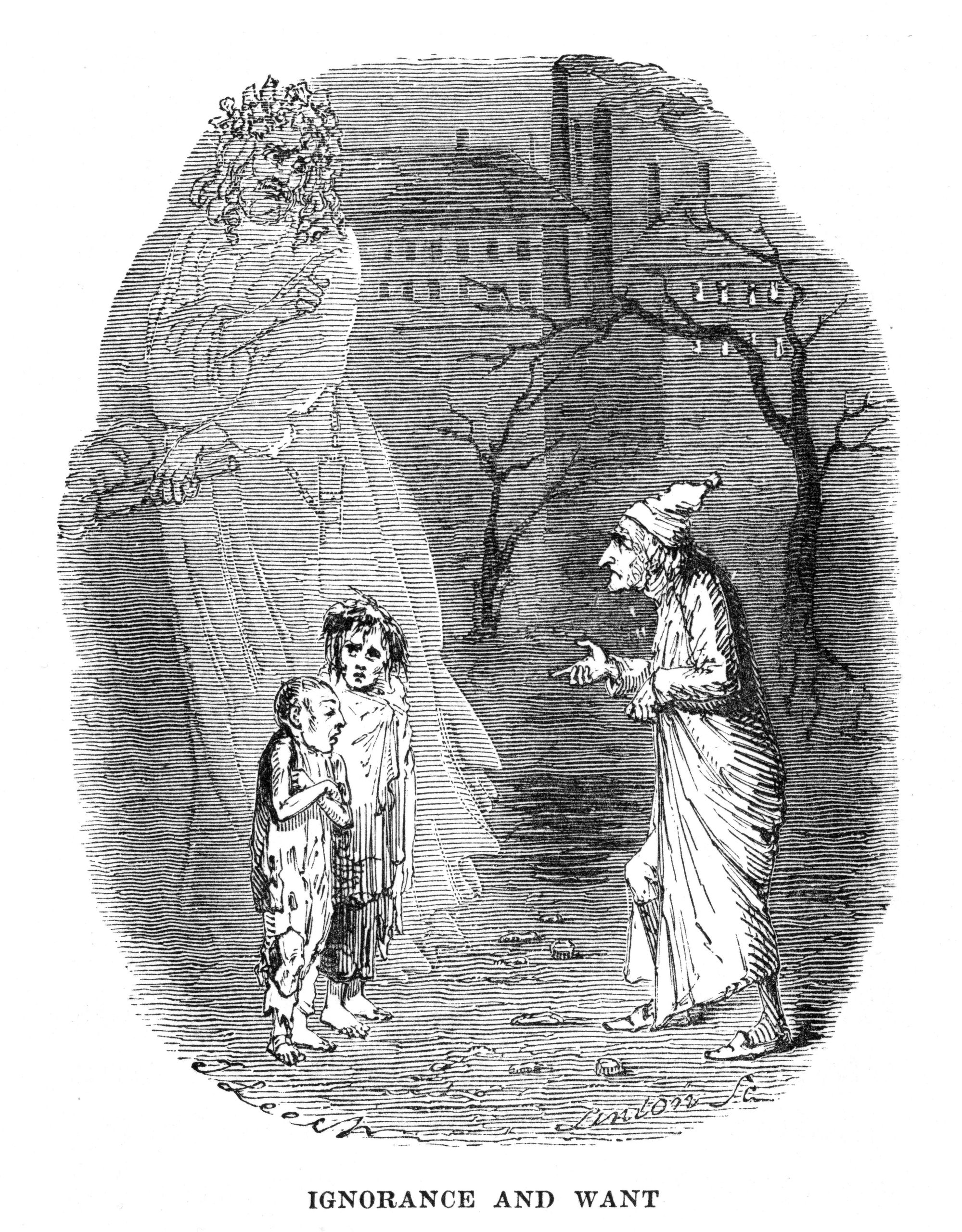 Los conceptos de "Ignorancia" y "Necesidad" también están en la obra, ya que el Fantasma del Presente se dirige de esta forma a un niño y una niña (de aspecto demacrado) respectivamente y advierte a Scrooge, "guárdate de los dos y de todos los de su género, porque en la frente lleva escrita la Condenación, a menos que se borre lo que lleva escrito" a lo que el avaro responde "no tienen refugio ni salvación".