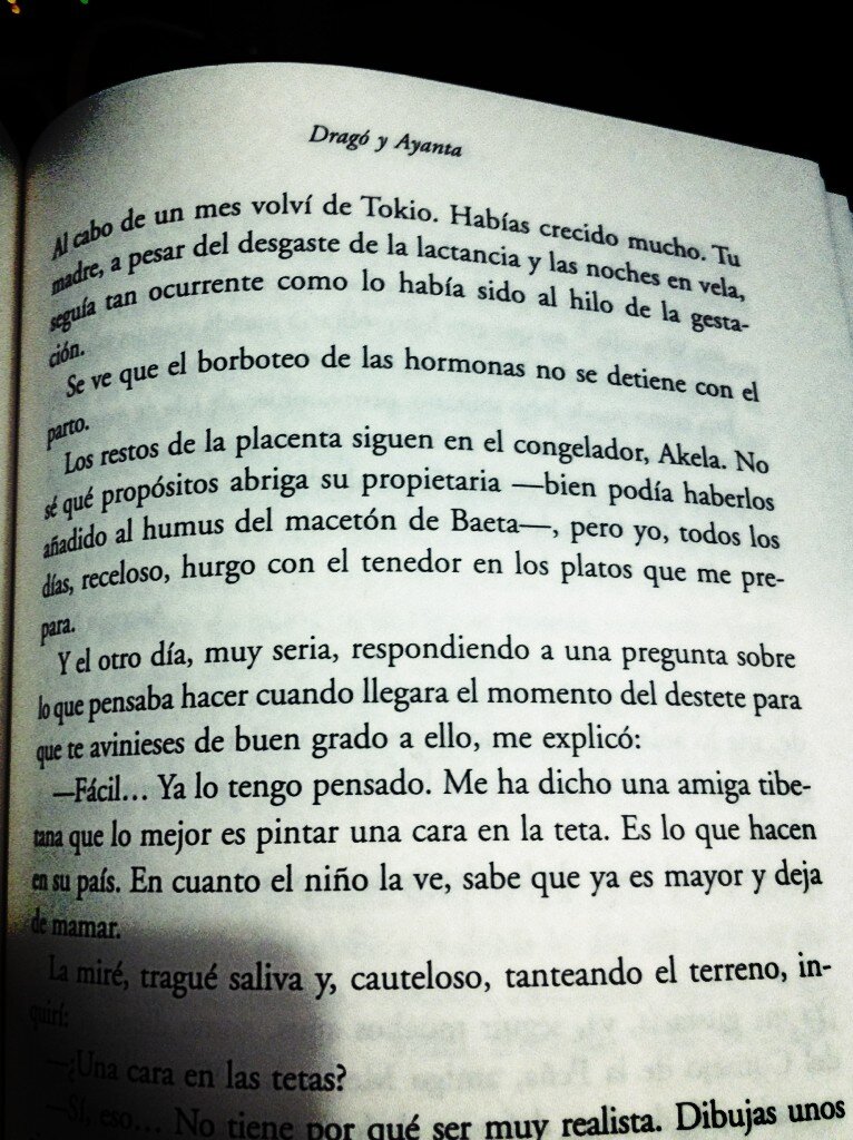 Ayanta Barilli me ha sorprendido. Ser hija de Dragó tiene que marcar, pero a simple vista me ha parecido una mujer normal, trabajadora, con algunos gustos peculiares, como todos (bueno, no todos: les diré que le gustan las habas crudas, y las toma como si fueran pipas). Sin embargo, nunca entendí bien qué tipo de herencia genética es la que el padre había dejado en la hija. Obviamente hay rasgos físicos, un gran interés por los viajes, un nombre extraño y un voraz instinto lector; pero lo que se ha revelado en este libro es una forma de contar las cosas fascinante. No soy objetiva, lo reconozco. Leer este libro es leer la agenda privada de una compañera, y me siento una cotilla. Tengo la sensación de estar enterándome de cosas que ella no me ha contado, y que le han pasado en un periodo bastante reciente. Todo lo que concierne a la concepción de su hermano Akela, la añoranza de su padre, la muerte de su madre, la (mala) relación con su padrastro, la llegada de sus dos hijos al mundo, sus aventuras en el teatro y el cine, el pormenorizado parto de Naoko... Tantas cosas que me sorprenden al tiempo, y que convierten a mi compañera en otra persona.