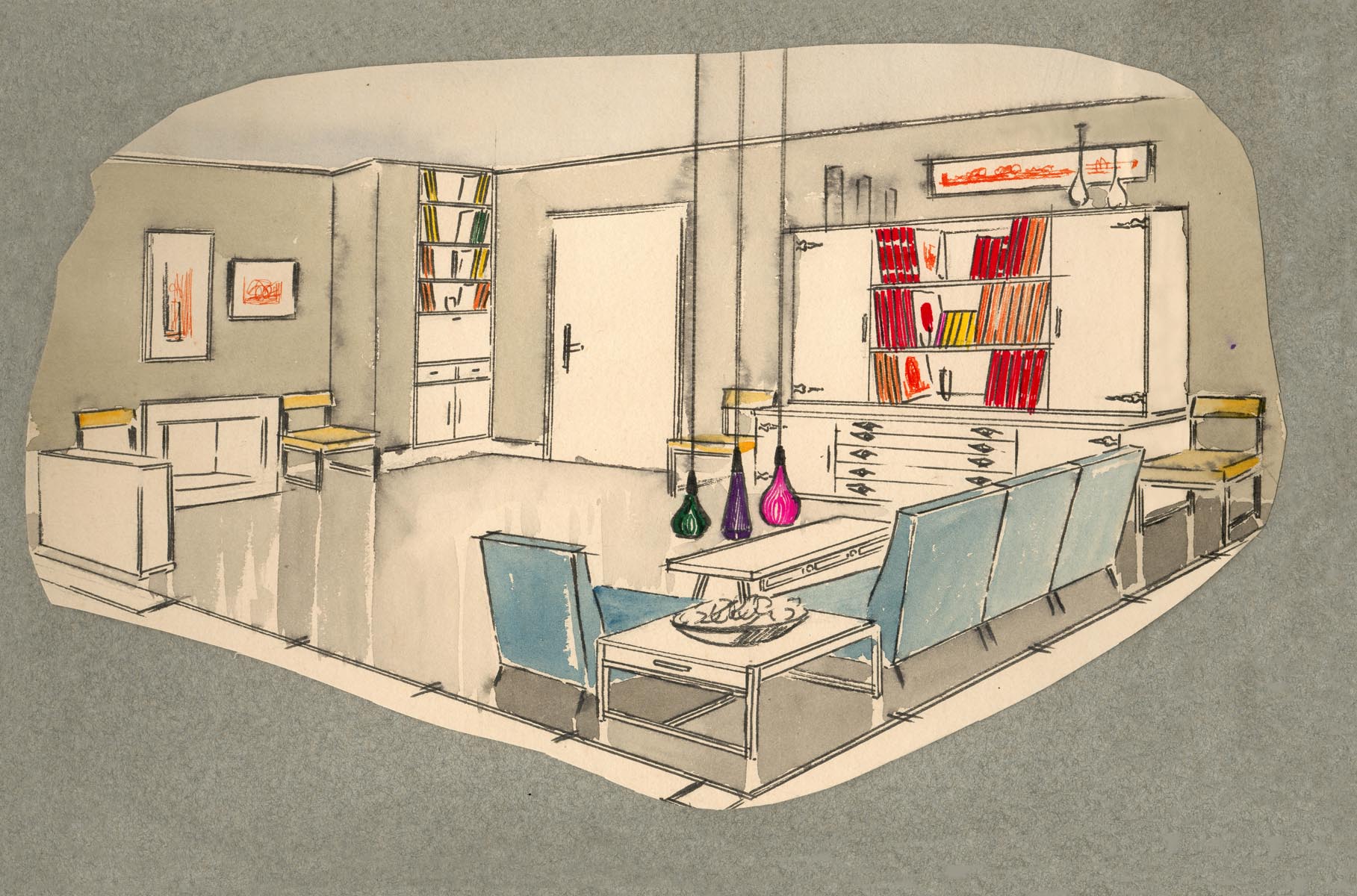 Proyecto para un salón de una casa moderna realizado por uno de los cientos de decoradores que aparecieron a lo largo de los años 60 en España.