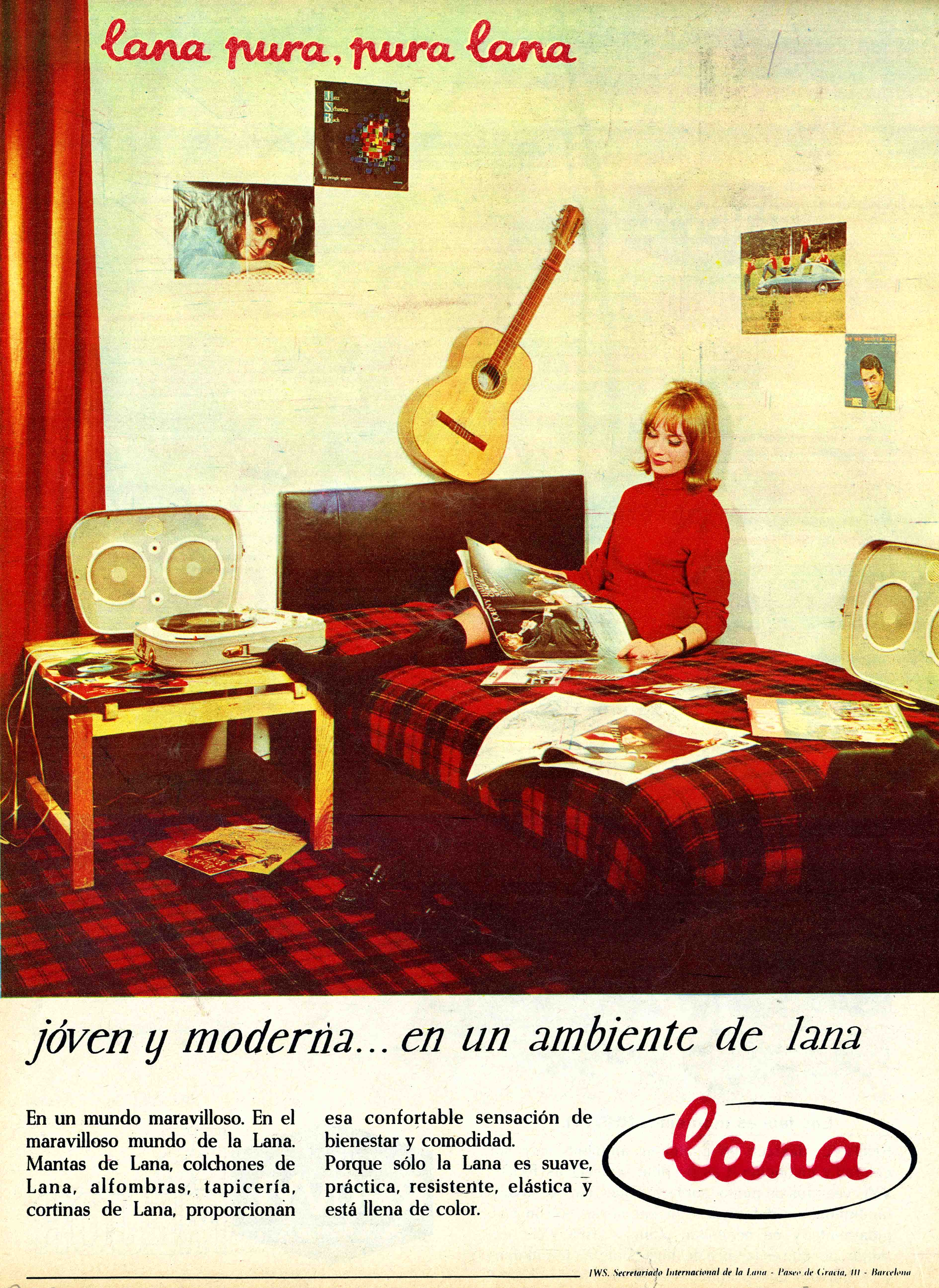 Cuarto juvenil de una chica yeyé: Portadas de discos en las paredes, el tocata en la mesilla de noche y la guitarra para acompañar tristes melodías como las de Françoise Hardy. Gaceta Ilustrada nº 390 (1964).
