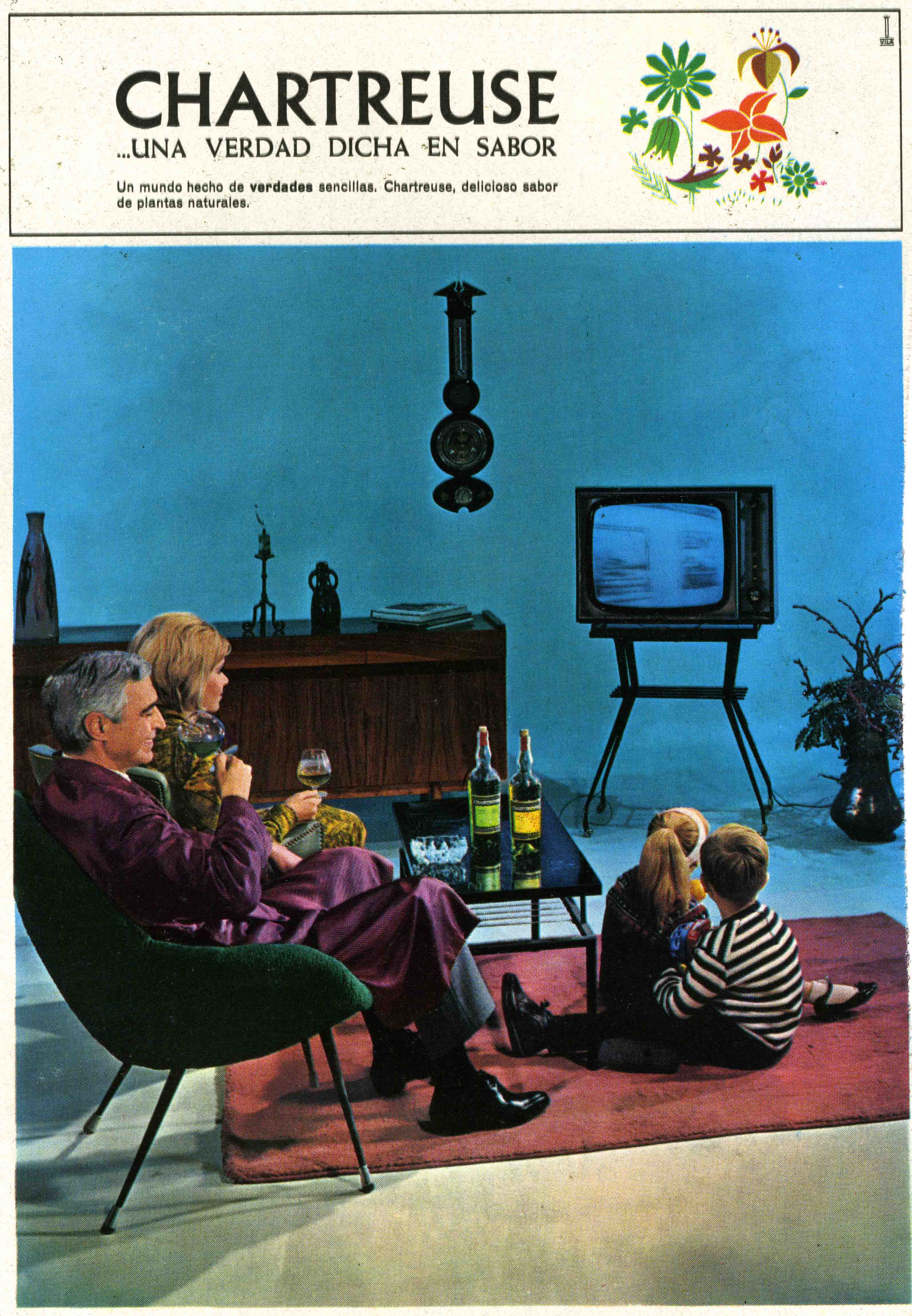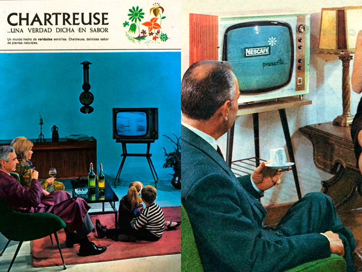 Los licores utilizaron para anunciarse los interiores modernos, con el televisor como máximo tótem electrónico del cambio operado en los hogares españoles en los años 60. (1965)