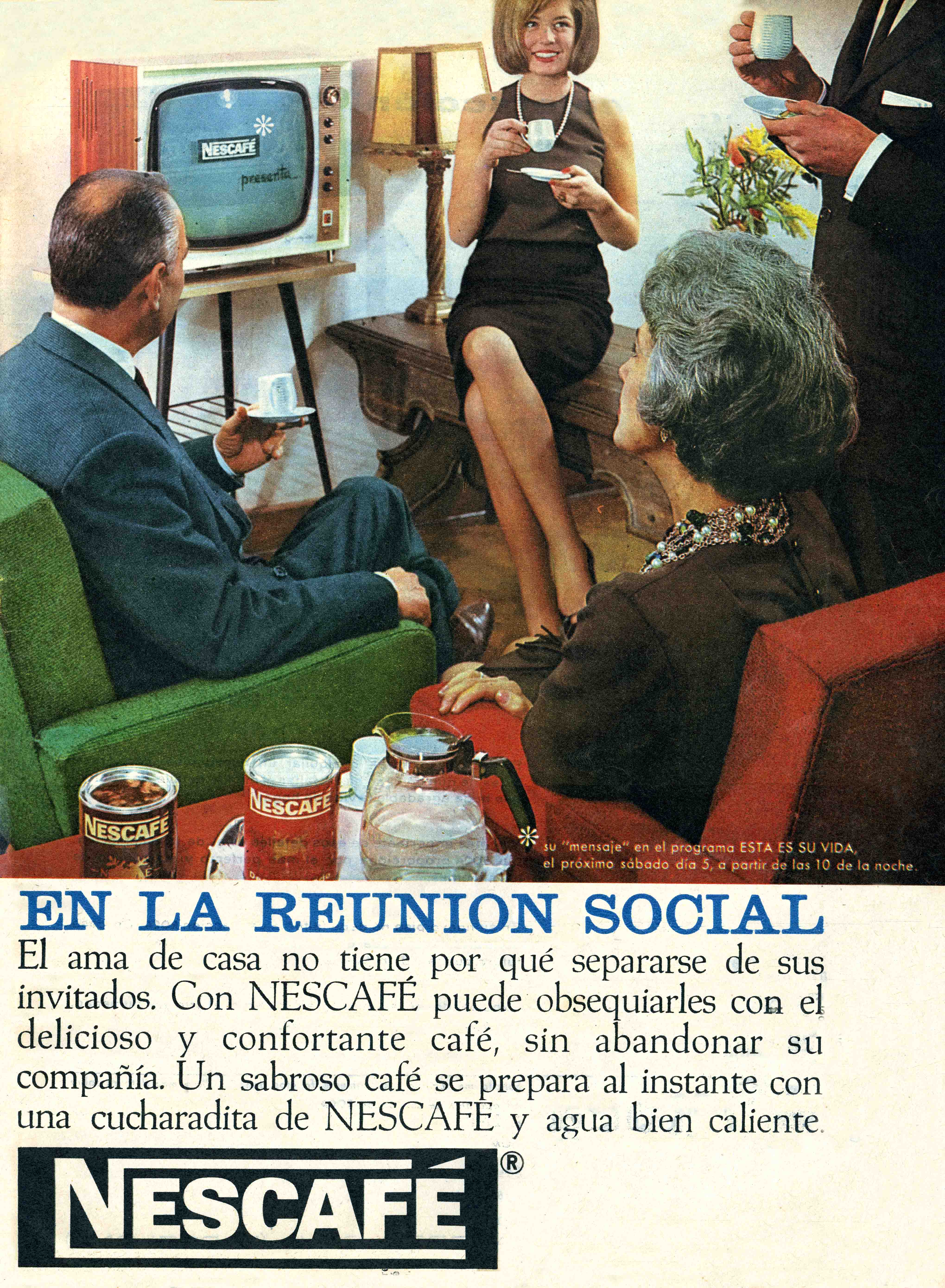 Una familia se reúne ante el televisor de punta en blanco para tomar Nescafé mientras presencian el anuncio de dicha marca realizado por Estudios Moro.