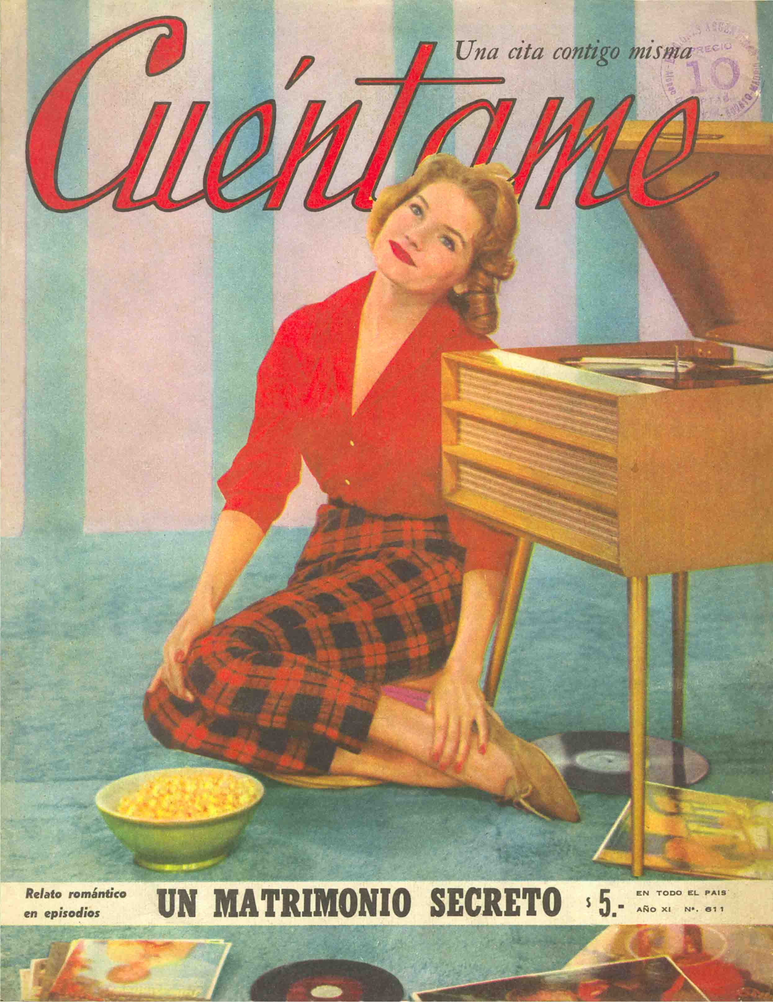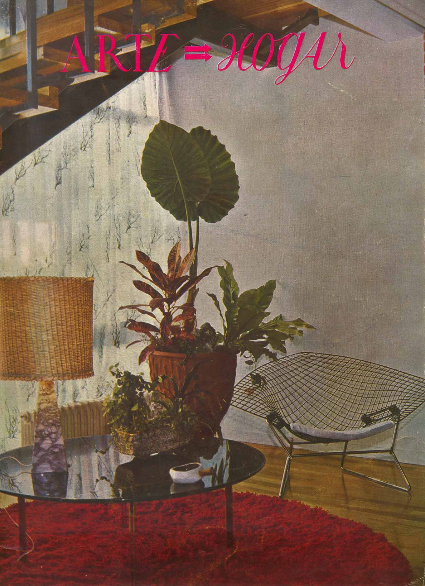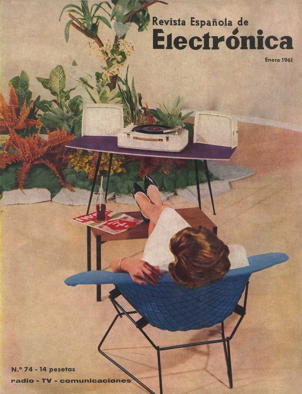 Lujo, elegancia y modernidad es lo que refleja esta portada de "Revista Española de Electrónica". Anuncia una maleta tocadiscos estéreo en un entorno sofisticado mediante la Alta Fidelidad y la silla de Bertoia.
