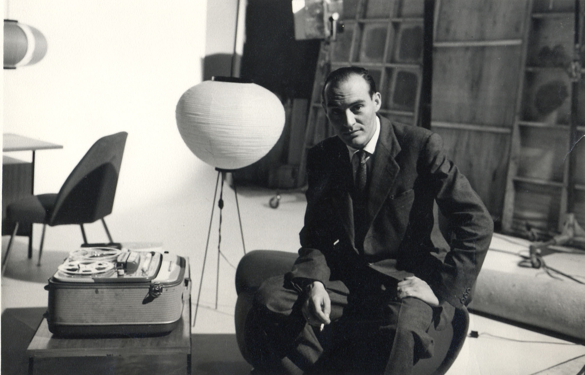 José Luis Moro fotografiado en un set de rodaje, rodeado de algunos de los elementos de atrezo que utilizaban para los anuncios con interiores modernos.